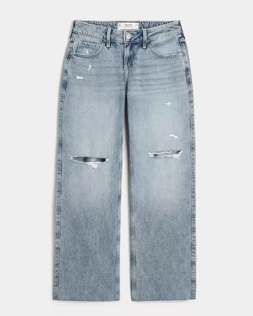 Comfortable denim jeans designed with a low-rise waist and baggy leg. Medium wash denim with ripped details and raw edged hems. Fading, whiskering. Imported.