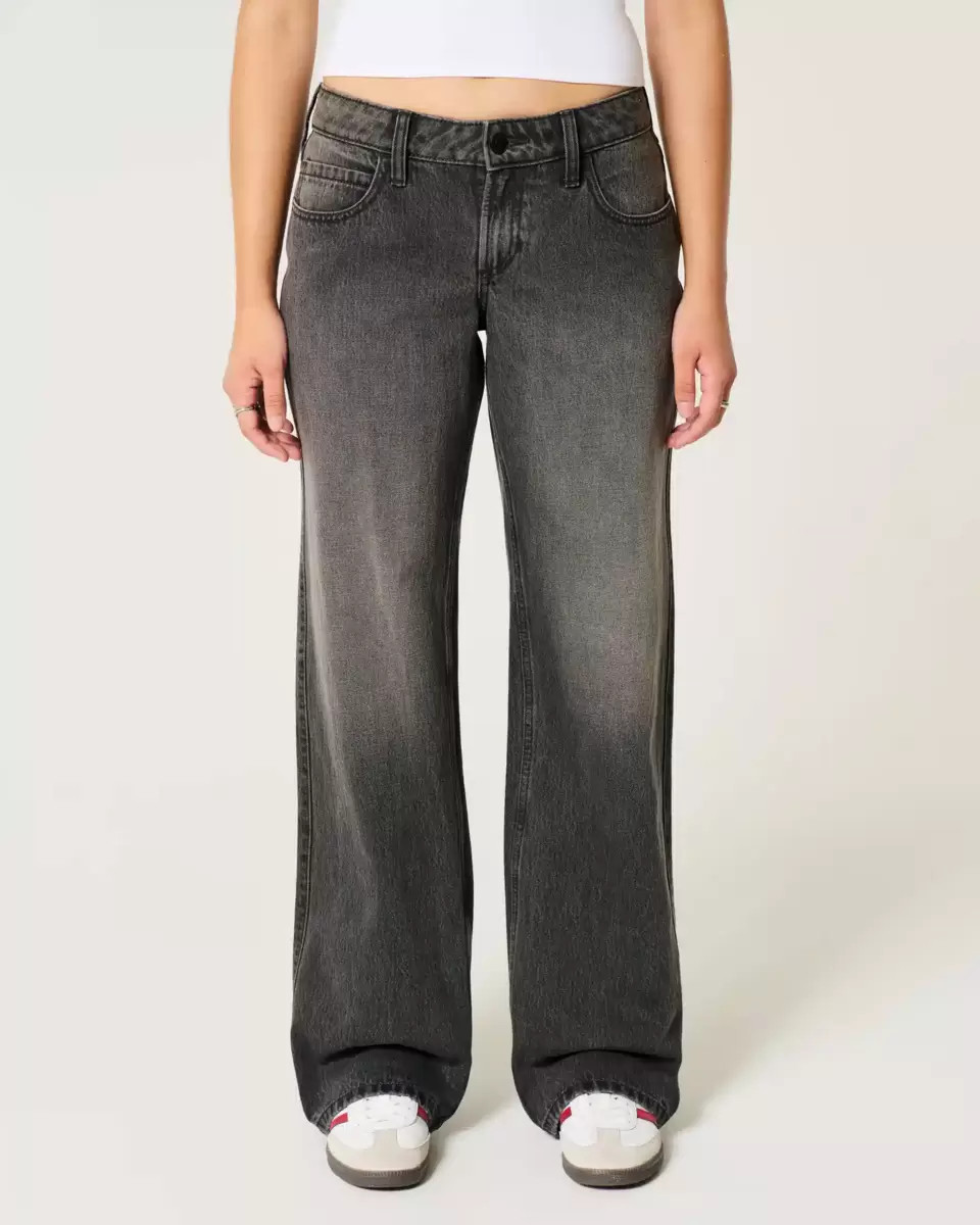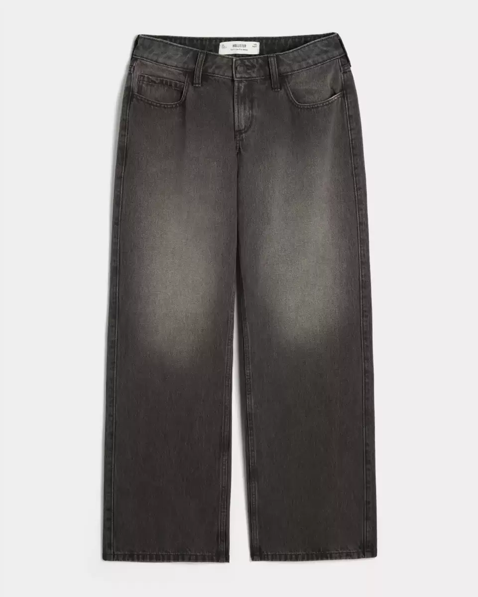These comfy jeans designed with a low-rise waist and baggy leg. Washed black denim with fading. Imported.