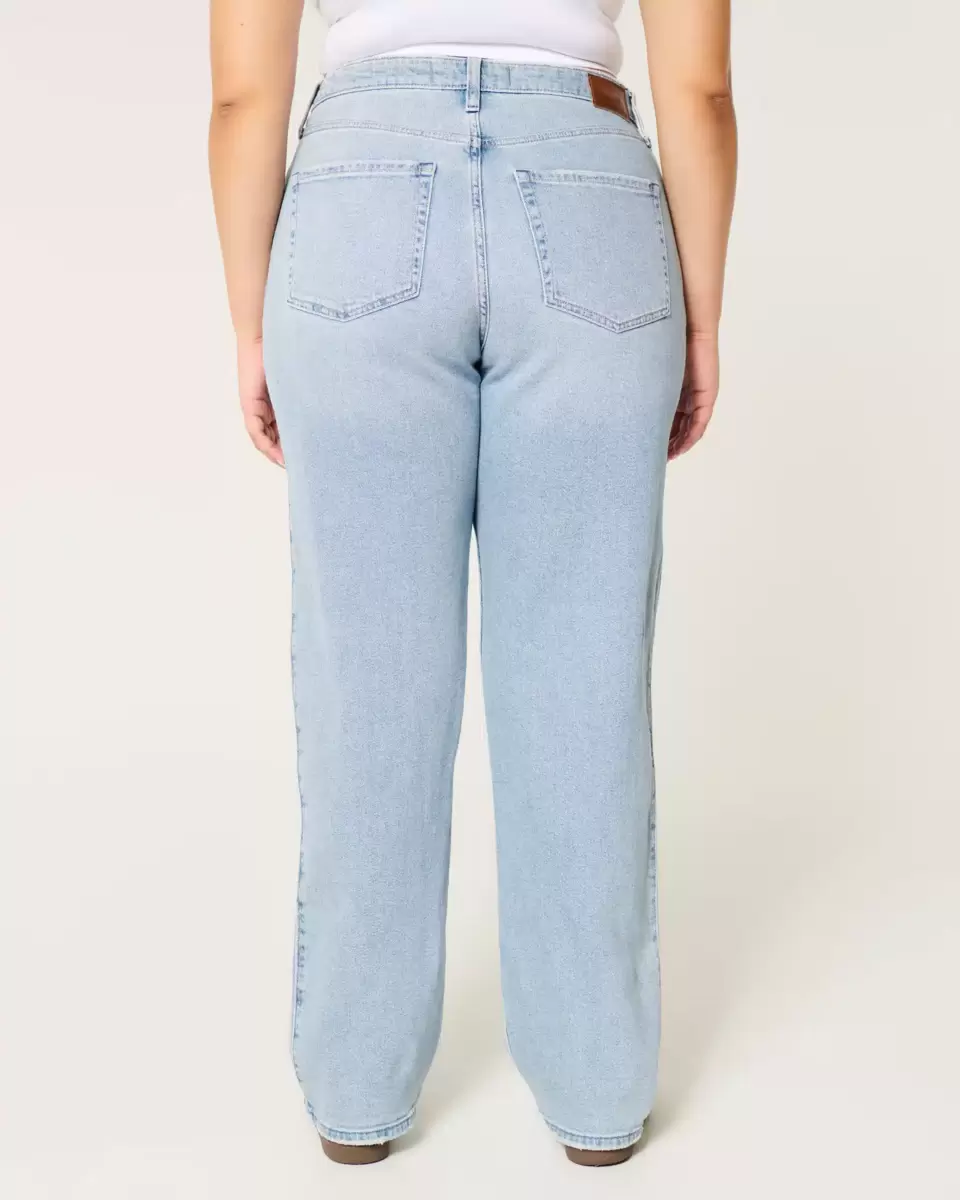 Designed with an ultra high-rise waist and relaxed leg. Vintage Stretch denim in a light wash with fading, whiskering and ripped details. Imported.