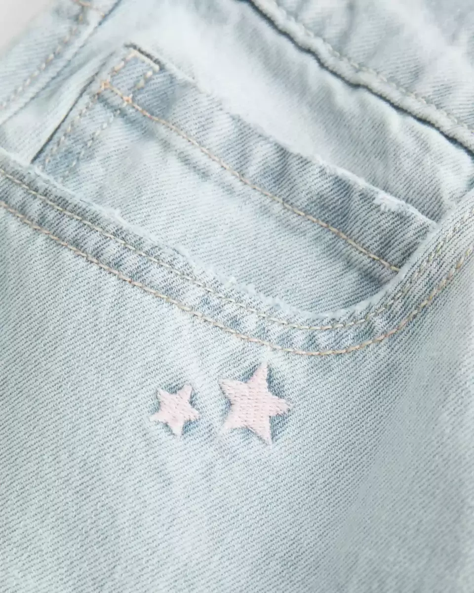 Comfortable denim jeans designed with a low-rise waist and baggy leg. Light wash, star embroidery, fading, whiskering.