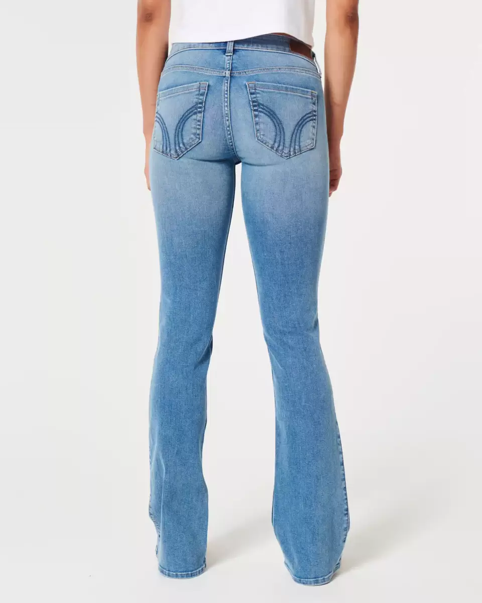 Slim through the thigh with a wider hem below the ankle, these medium wash boot jeans feature a trendy low-rise waist. Fading and whiskering. Imported.
