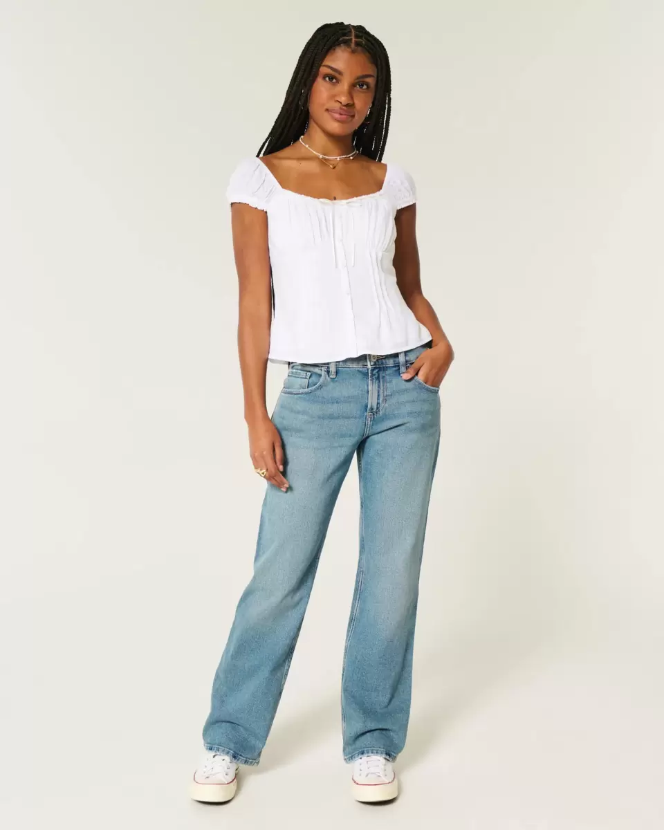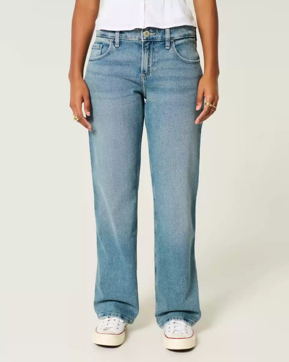 Comfortable denim jeans designed with a low-rise waist and relaxed straight leg. Medium wash with fading and whiskering. Imported.