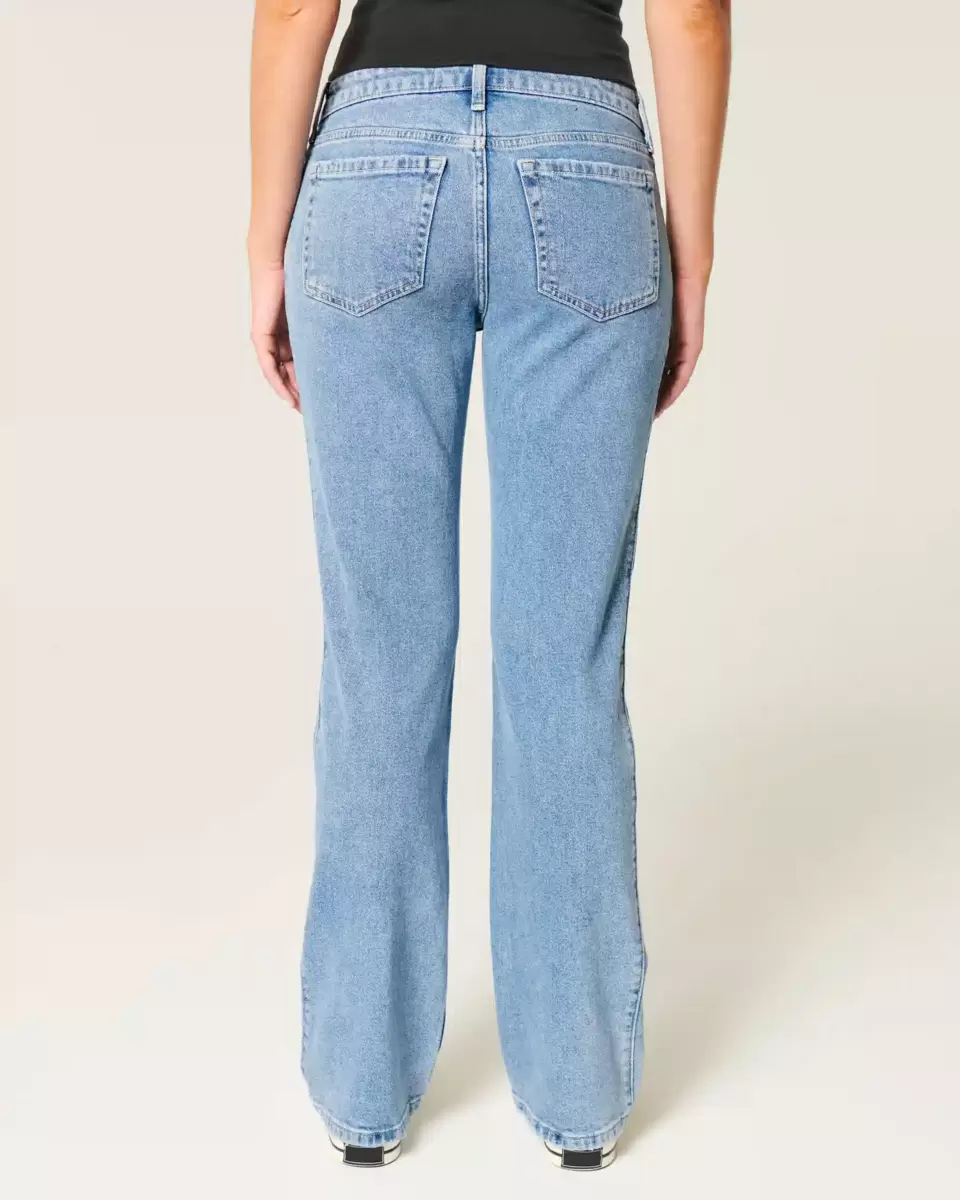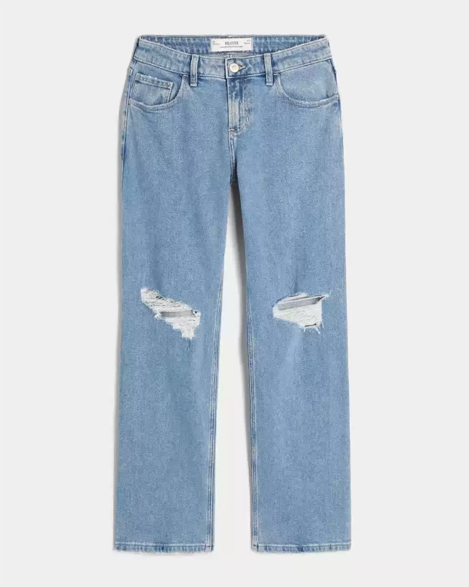 Comfortable denim jeans designed with a low-rise waist and relaxed straight leg. Medium wash with ripped details. Imported.