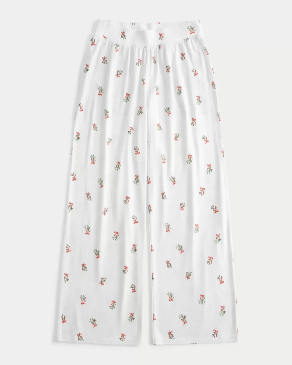 Super soft pajama pants with a banded waist and all-over mistletoe pattern. Wide-leg silhouette.