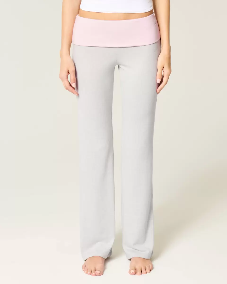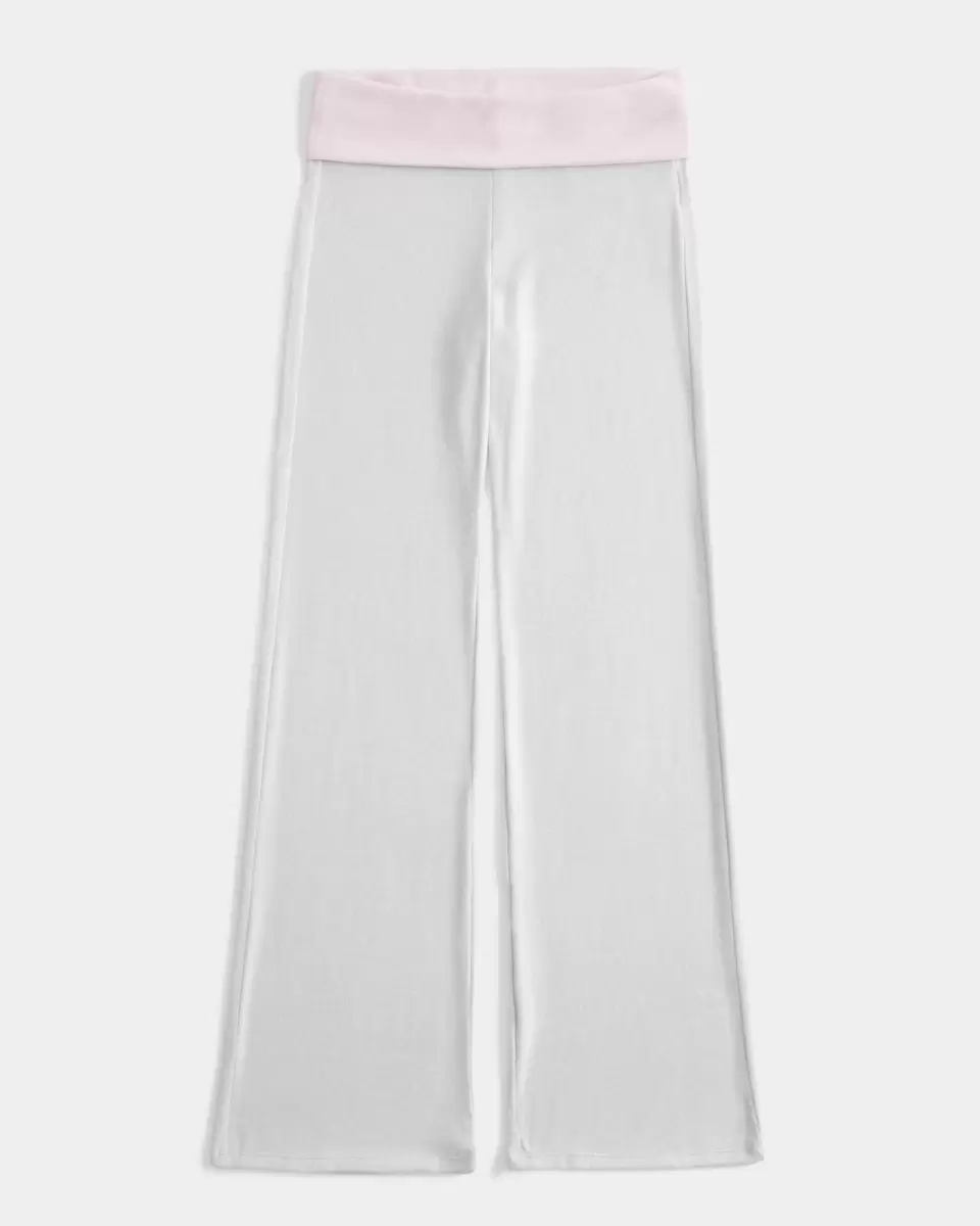 Cozy and super soft knit flare pants with a colorblock foldover waistband. Pockets, adjustable rise.