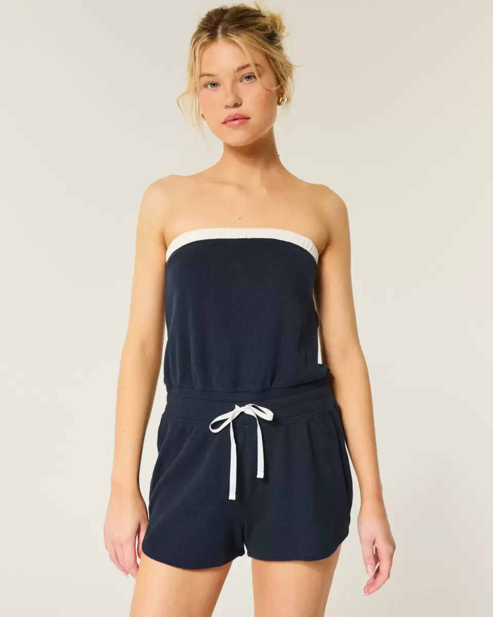 A cute and cozy onesie in super soft waffle fabric. Strapless, drawstring waist. Imported.