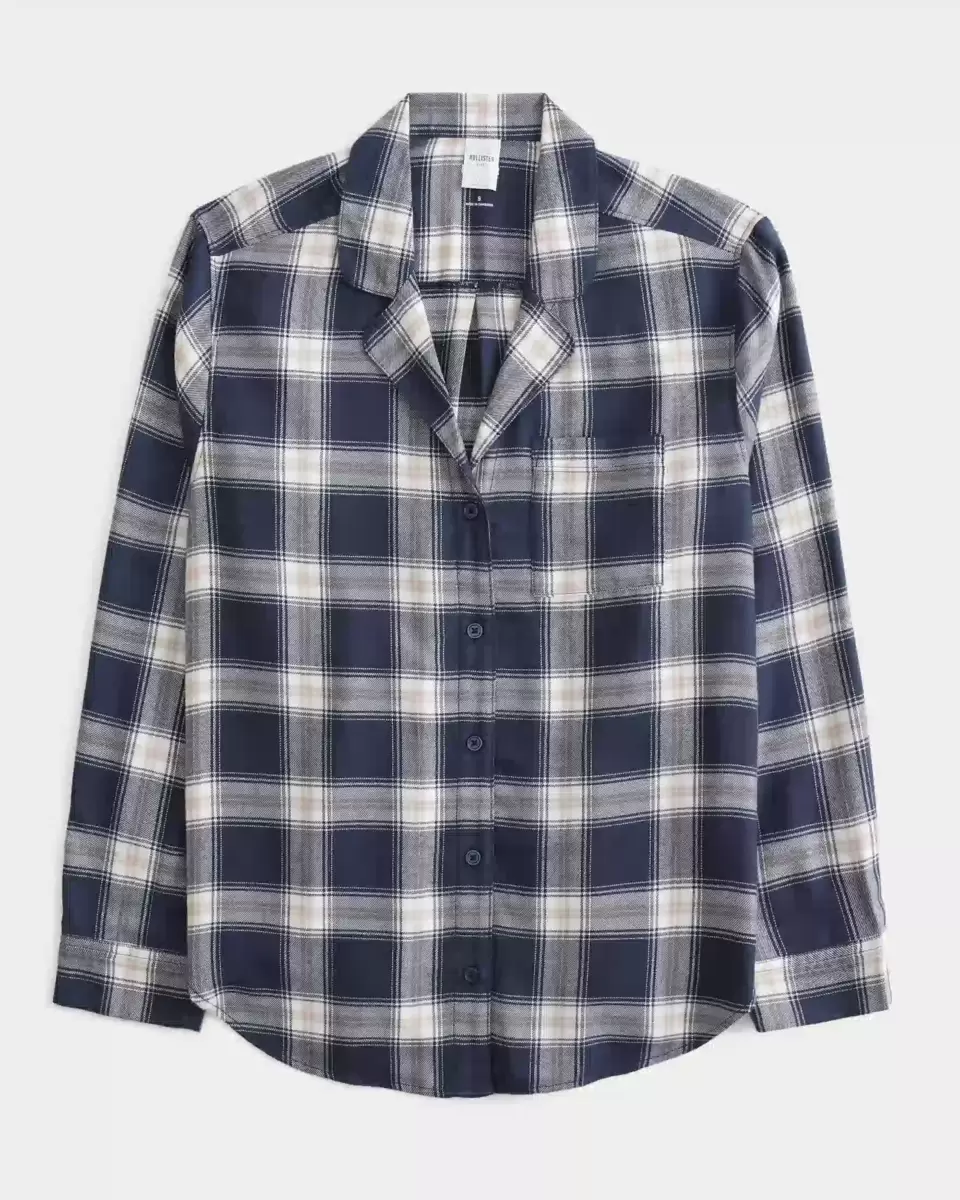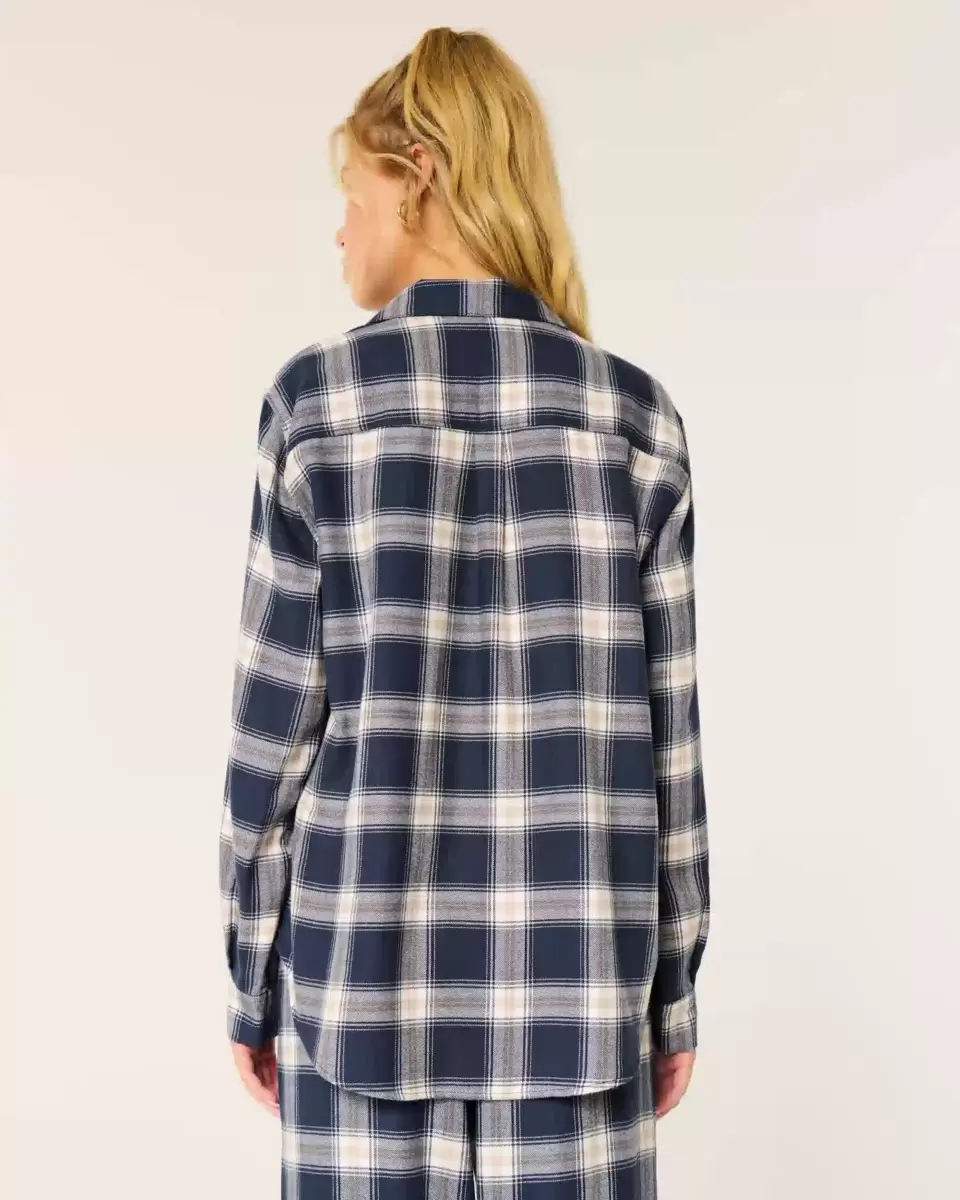 A cozy and super soft flannel sleep shirt with a full button closure, collar and left chest pocket. Curved hem. Easy Fit. Imported.