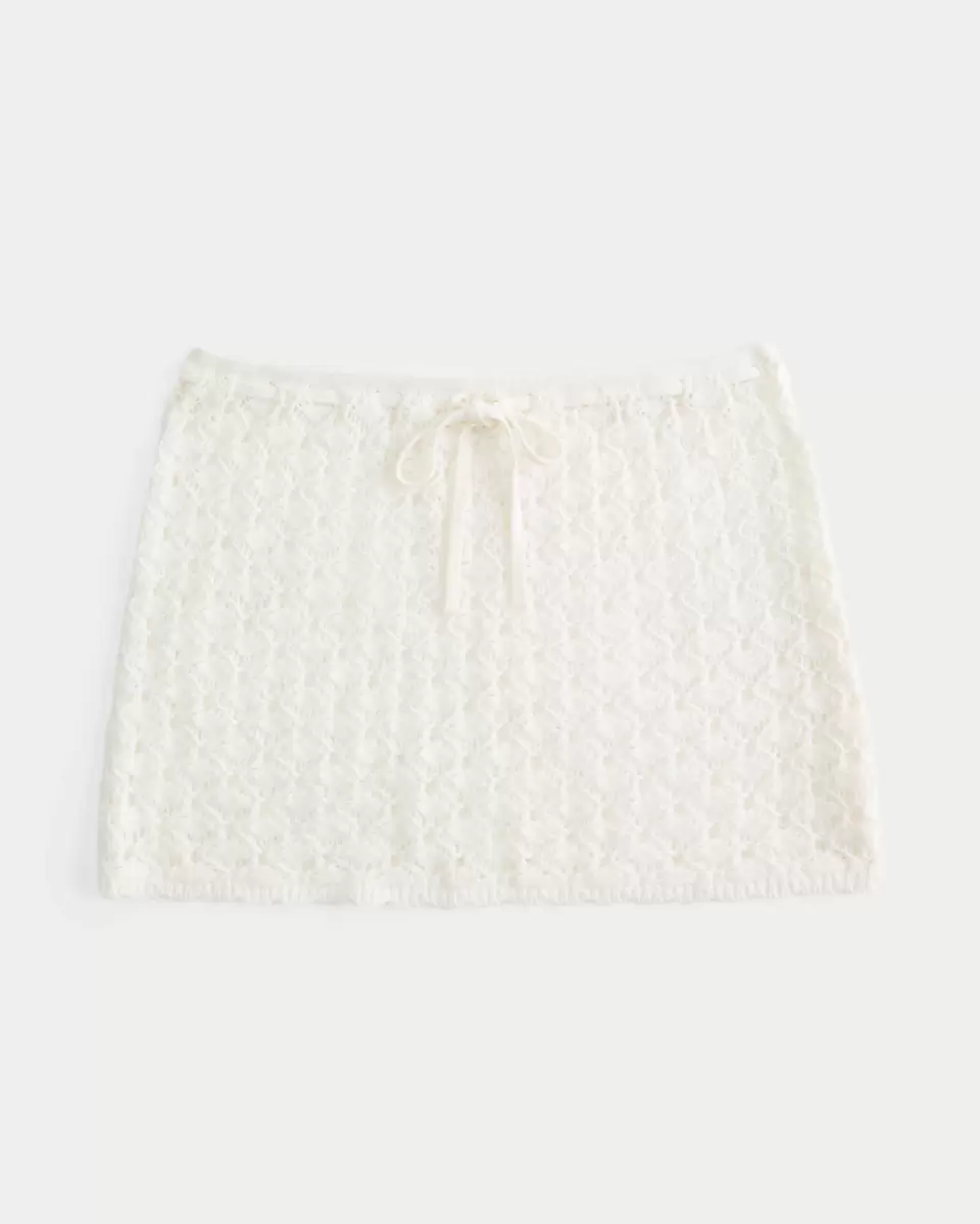 This cute and super soft swim cover up skirt is made with pretty crochet-style fabric. Pull-on drawstring waist. Imported.
