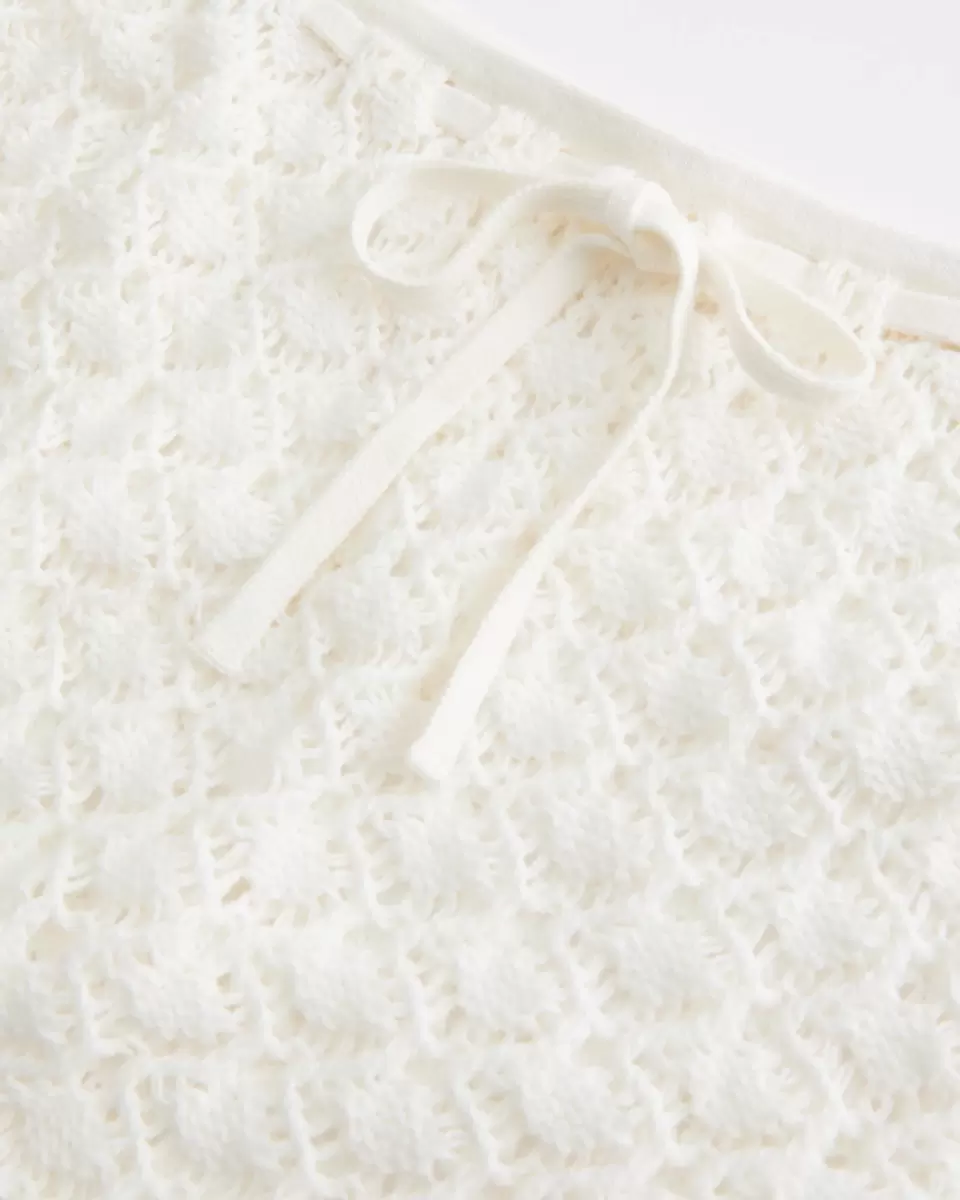 This cute and super soft swim cover up skirt is made with pretty crochet-style fabric. Pull-on drawstring waist.