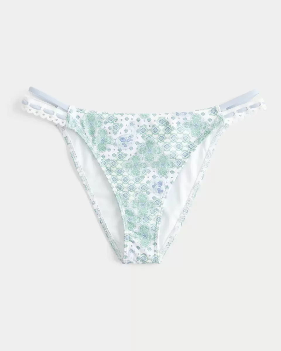A cute bikini bottom featuring double side straps with crochet-style trim. Cheeky coverage. Imported.