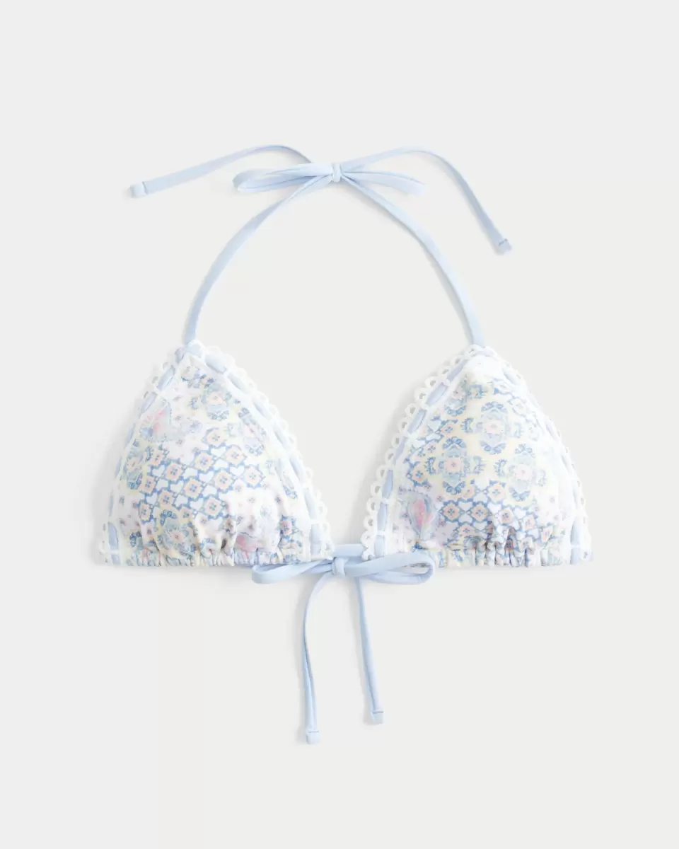 This cute bikini top is made with soft swim fabric and features a tie closure, crochet-style trim and removable padding. Classic triangle silhouette with halter ties.