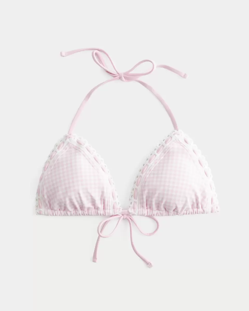 This cute bikini top is made with soft swim fabric and features a tie closure, crochet-style trim and removable padding. Classic triangle silhouette with halter ties. Imported.