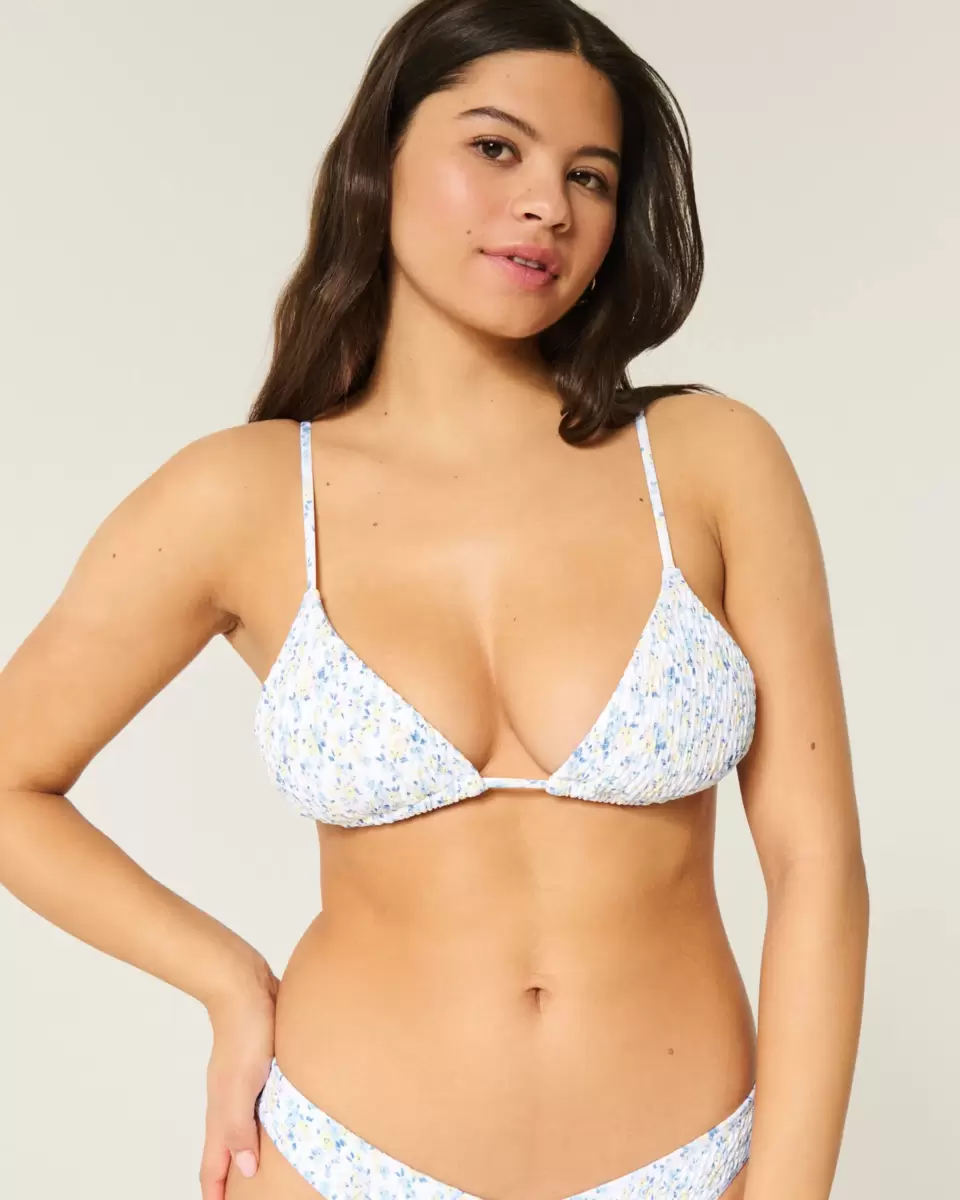 A cute and comfy bikini top in soft smocked swim fabric. Adjustable shoulder straps, tie back, removable padding. Imported.