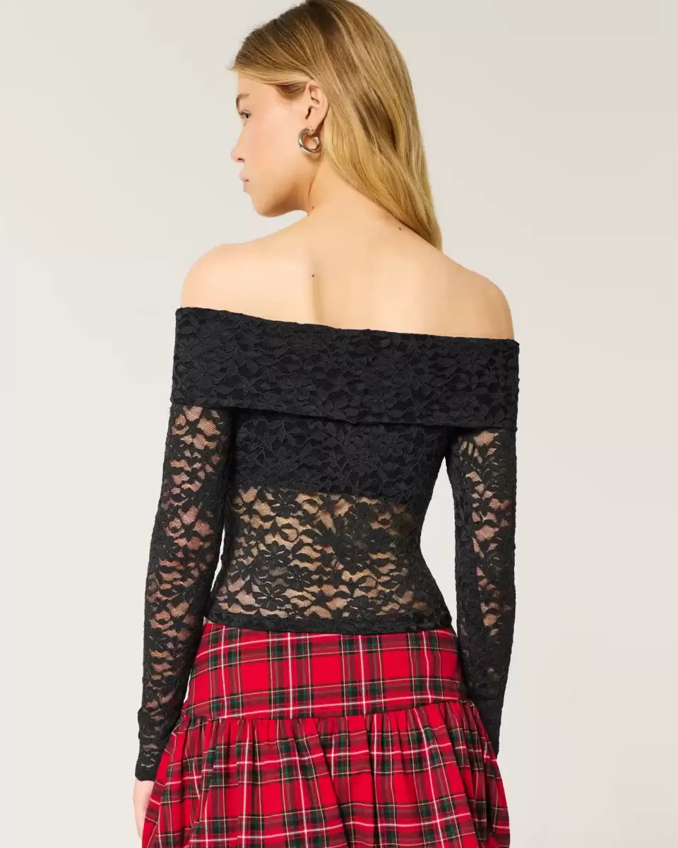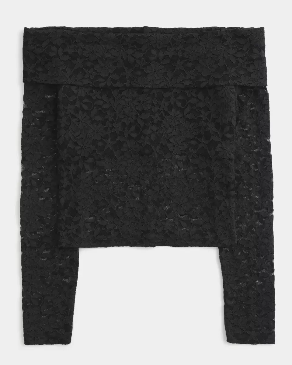 A pretty and super soft top in all-over lace with long sleeves and a foldover off-the-shoulder neckline. Interior lining at bust. Imported.