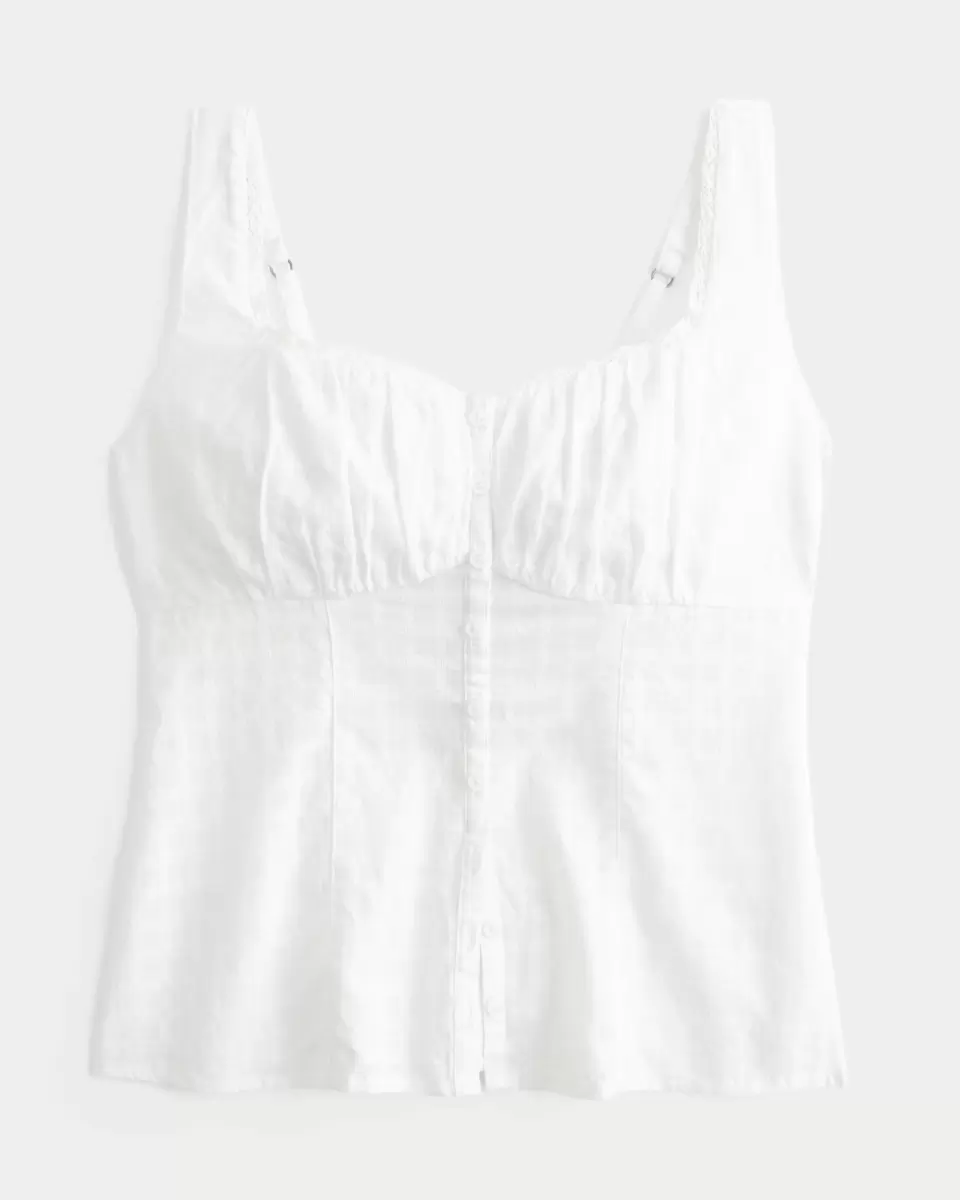 This cute top is made with super soft crosshatch fabric and features ruched detailing through the bust. Button details, adjustable straps, lace trim along the neckline. Slim Fit.