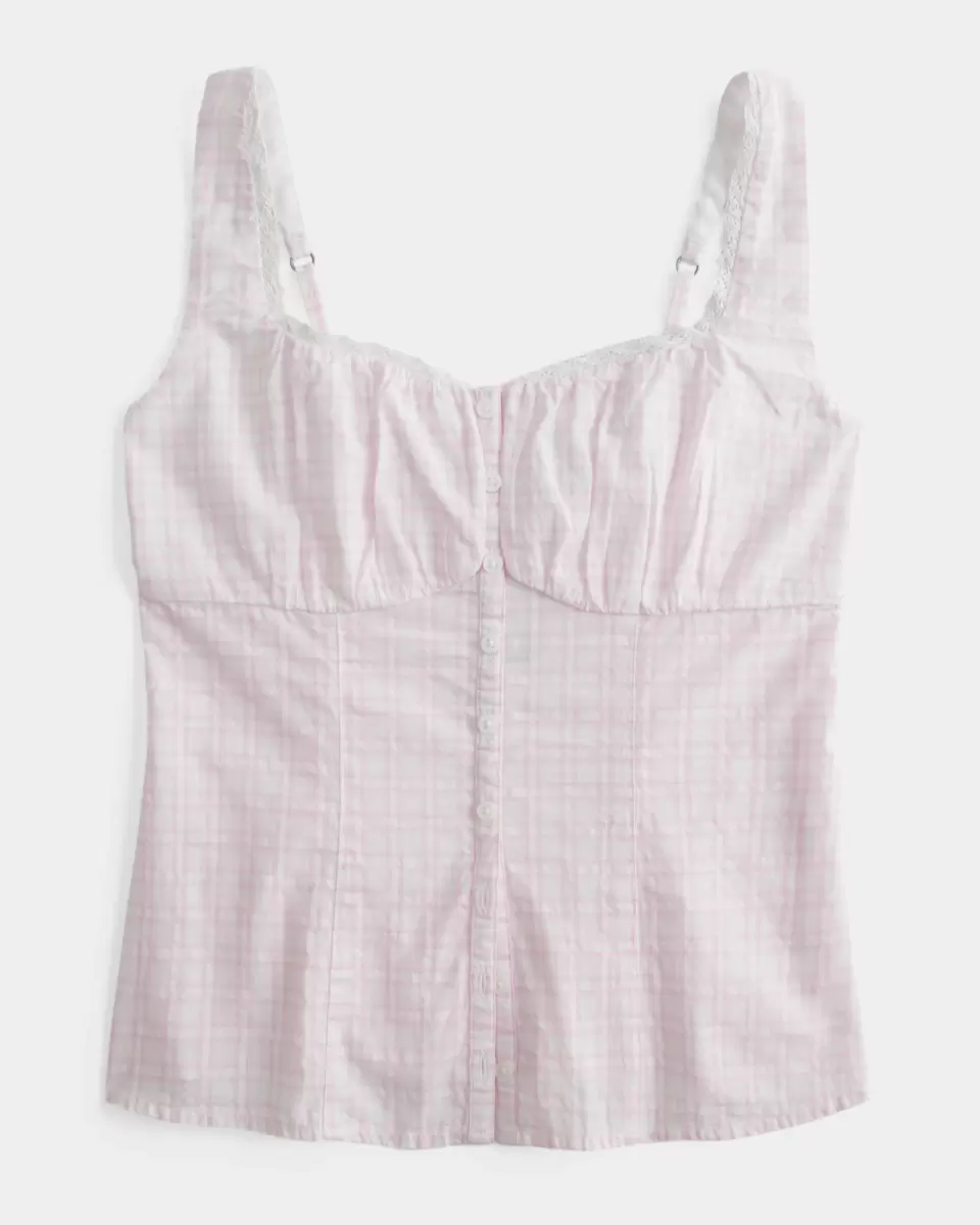 This cute poplin blouse features a button-through closure and lace detailing along the neckline. Soft textured fabric, adjustable straps, looks perfect dressed up or down! Slim Fit