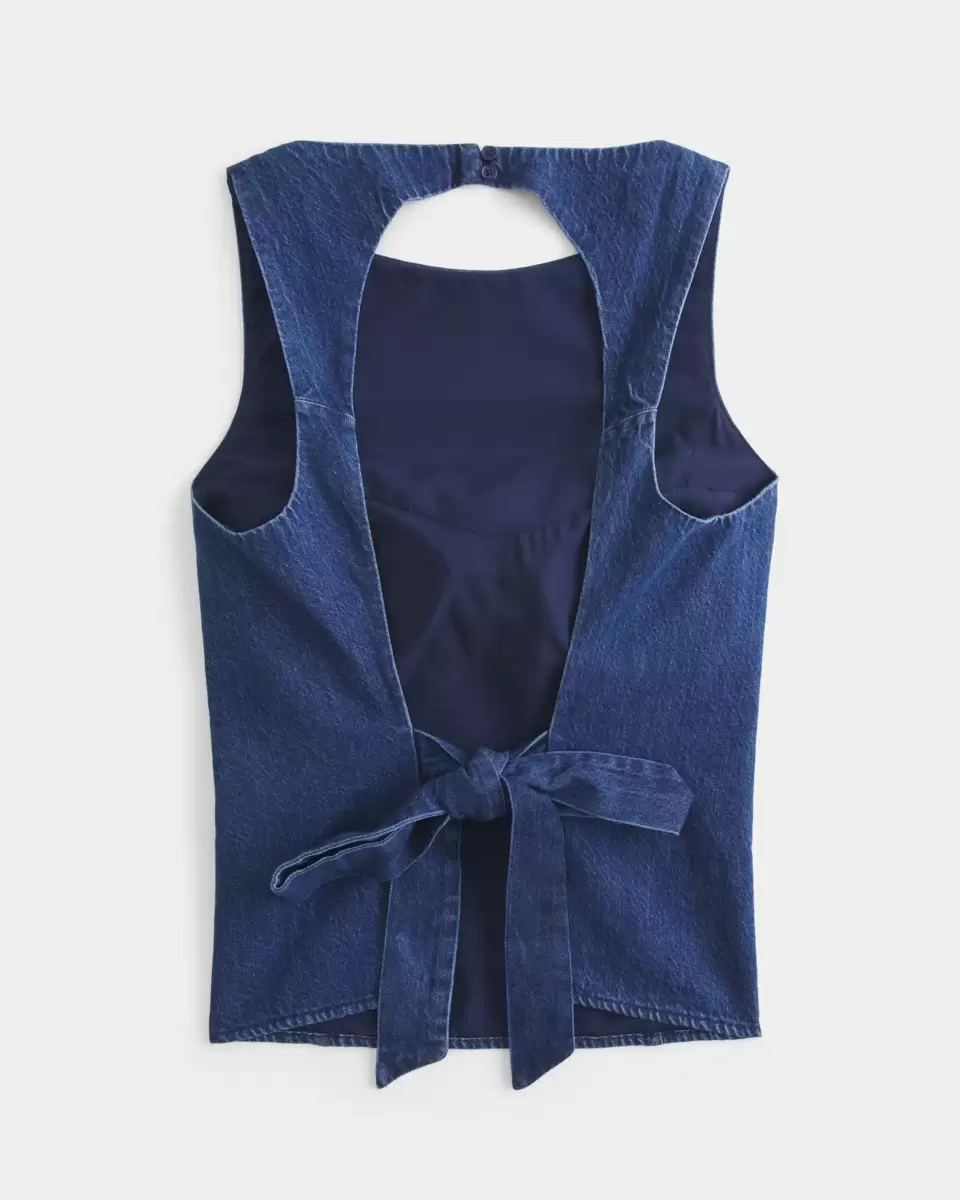 A super cute top in denim, designed with an open back and high neckline. Back tie closure, seam details. Slim Fit. Imported.