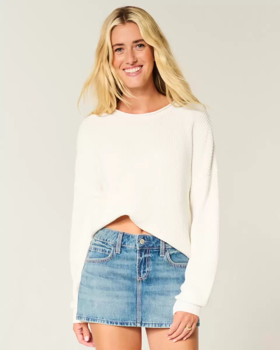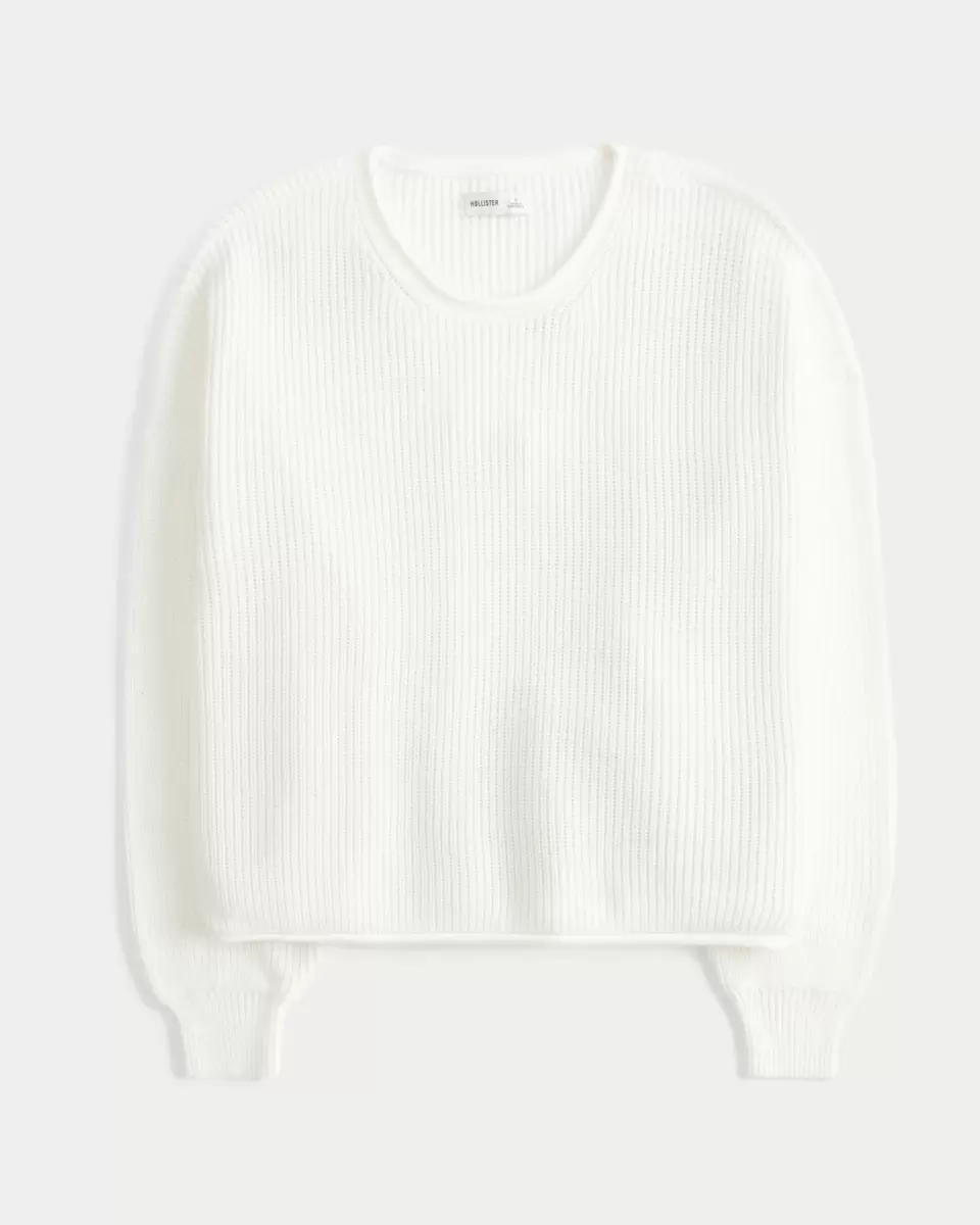 A super soft and cozy sweater with a curled crew neckline and hem. Ribbed sleeve hems. Easy Fit. Imported.