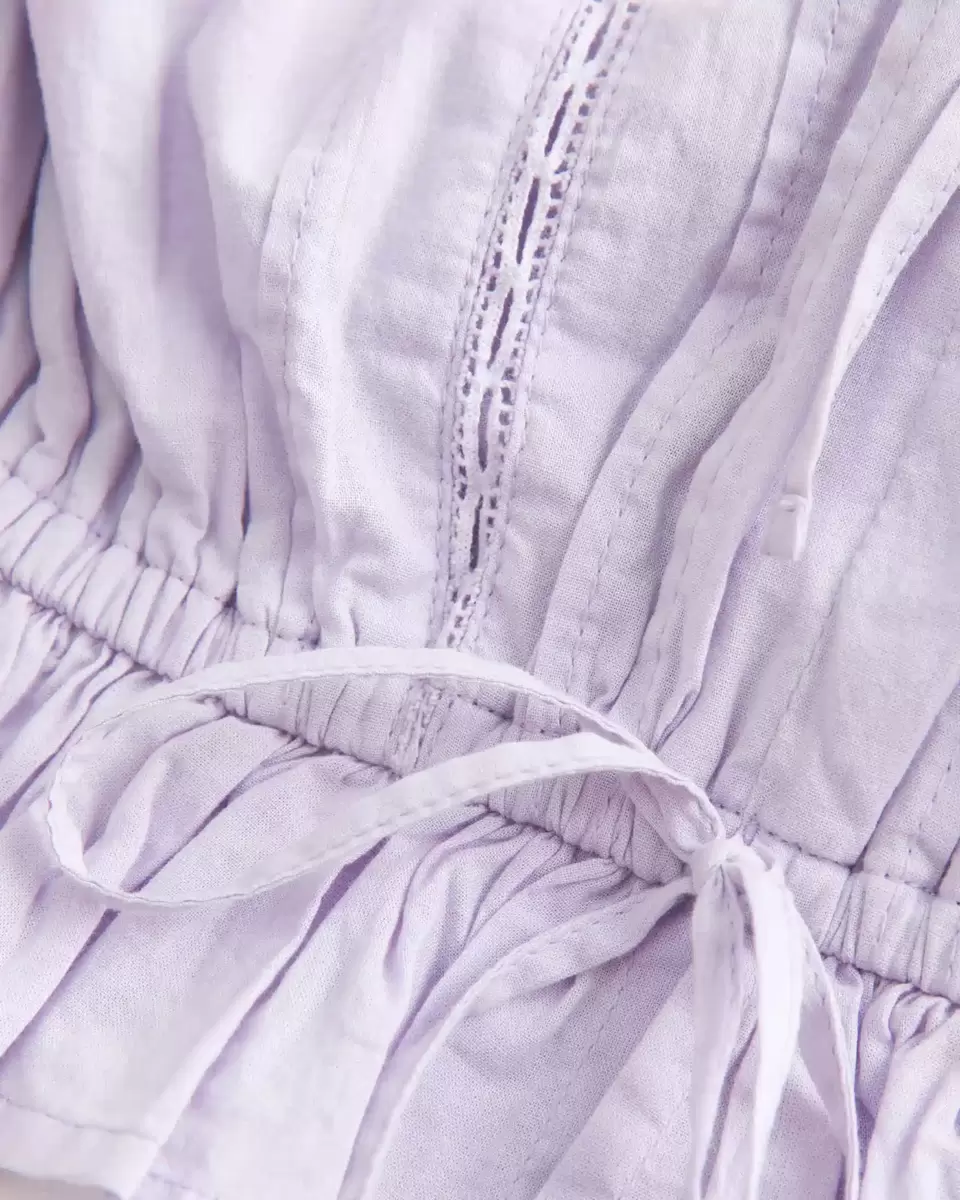 This super soft tube top is perfect for warm, sunny weather! Made with voile fabric, strapless silhouette with ties at the neckline and waist, pretty lace insets, ruffle trims. Eas