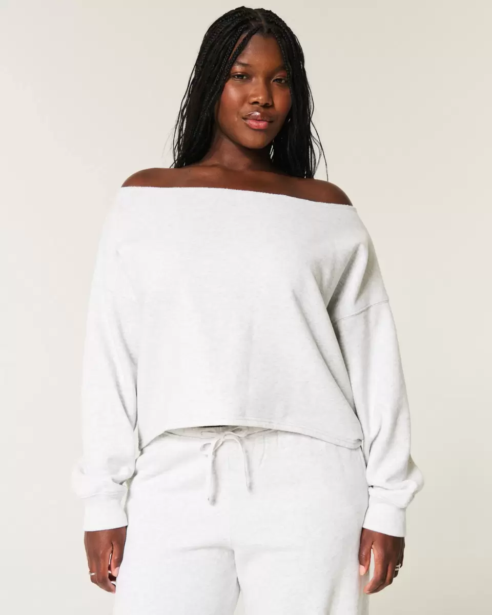 A cozy and super soft sweatshirt with long sleeves and an off-the-shoulder neckline. Easy Fit. Imported.