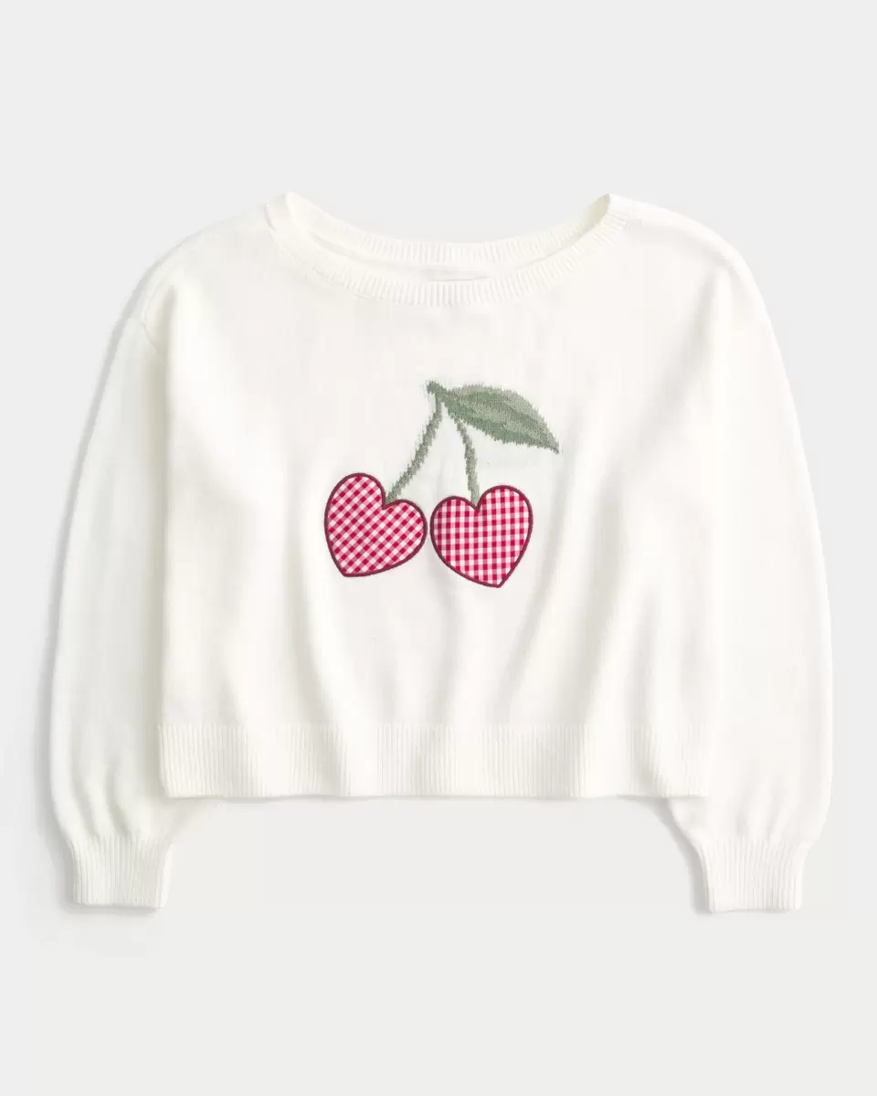 Cozy and super soft, this sweater features Valentine’s Day-inspired heart cherry intarsia graphics and applique. Relaxed neckline can be worn off one shoulder, ribbed trims, long sleeves. Easy Fit. Imported.