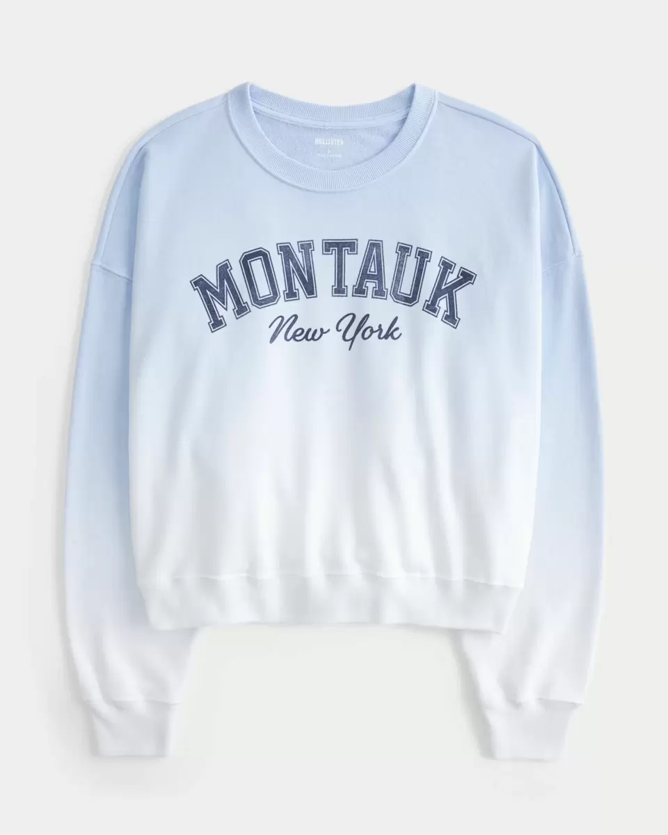 A super soft fleece sweatshirt featuring a Montauk New York print graphic, crew neckline and long sleeves. Dip-dyed look. Easy Fit. Imported.