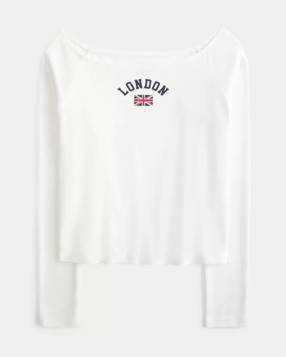 A super soft long-sleeve tee featuring an off-the-shoulder neckline and London print graphic. Easy Fit. Imported.