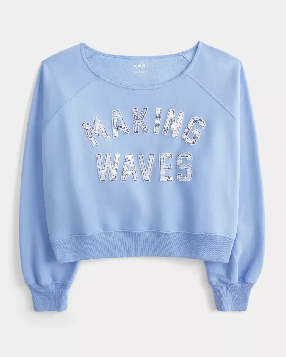 A super soft fleece sweatshirt featuring Making Waves graphic applique and an off-the-shoulder neckline. Long sleeves. Easy Fit. Imported.