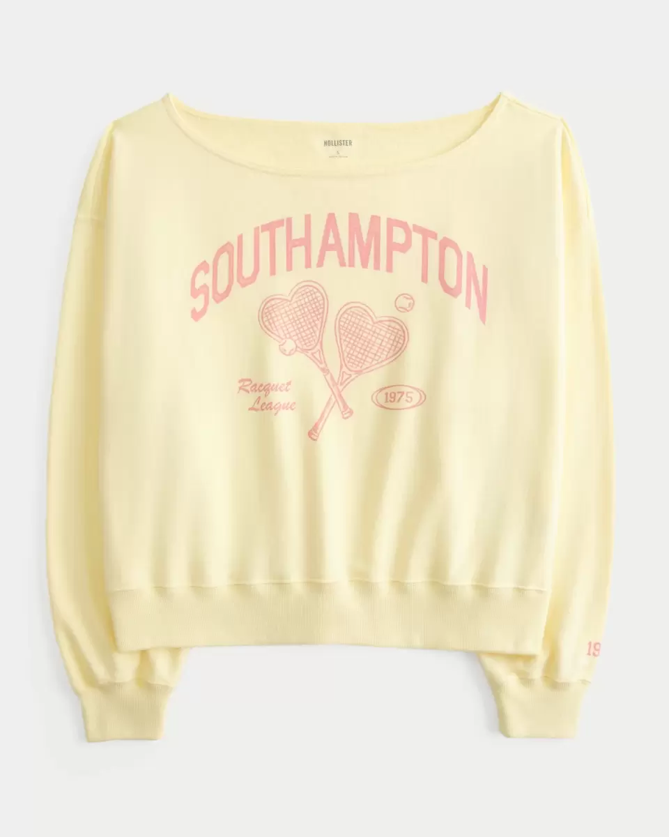 A super soft fleece sweatshirt featuring Southampton print graphics, an off-the-shoulder neckline and long sleeves. Easy Fit. Imported.