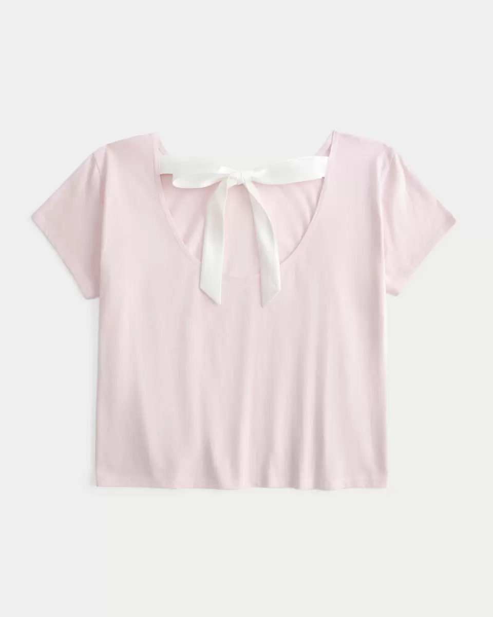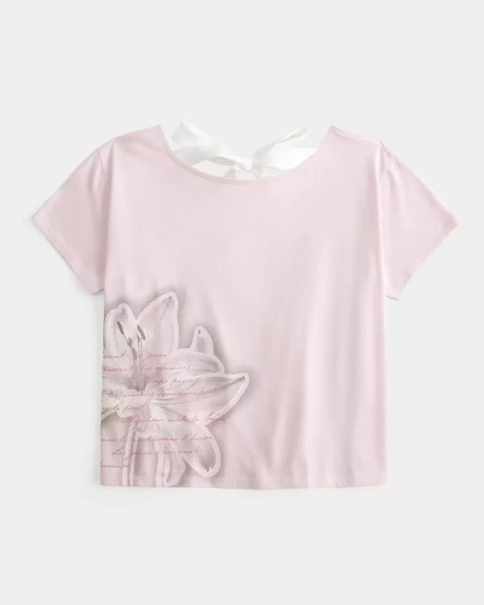 Cute and super soft, this tee features floral print graphics with French script details and a ribbon back tie detail. Short sleeves. Easy Fit. Imported.