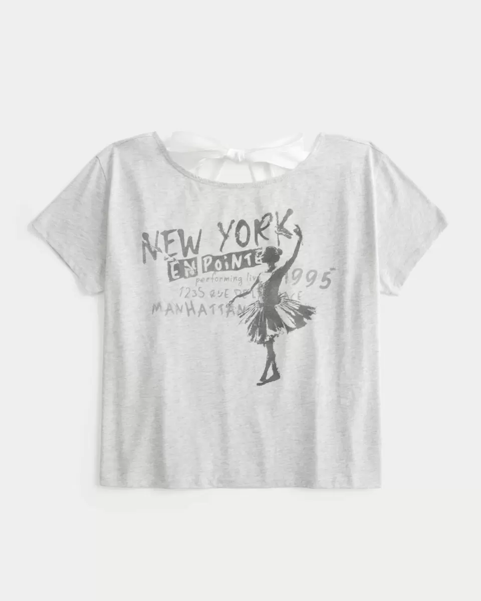 Cute and super soft, this tee features New York print graphics and a ribbon back tie detail. Short sleeves. Easy Fit. Imported.