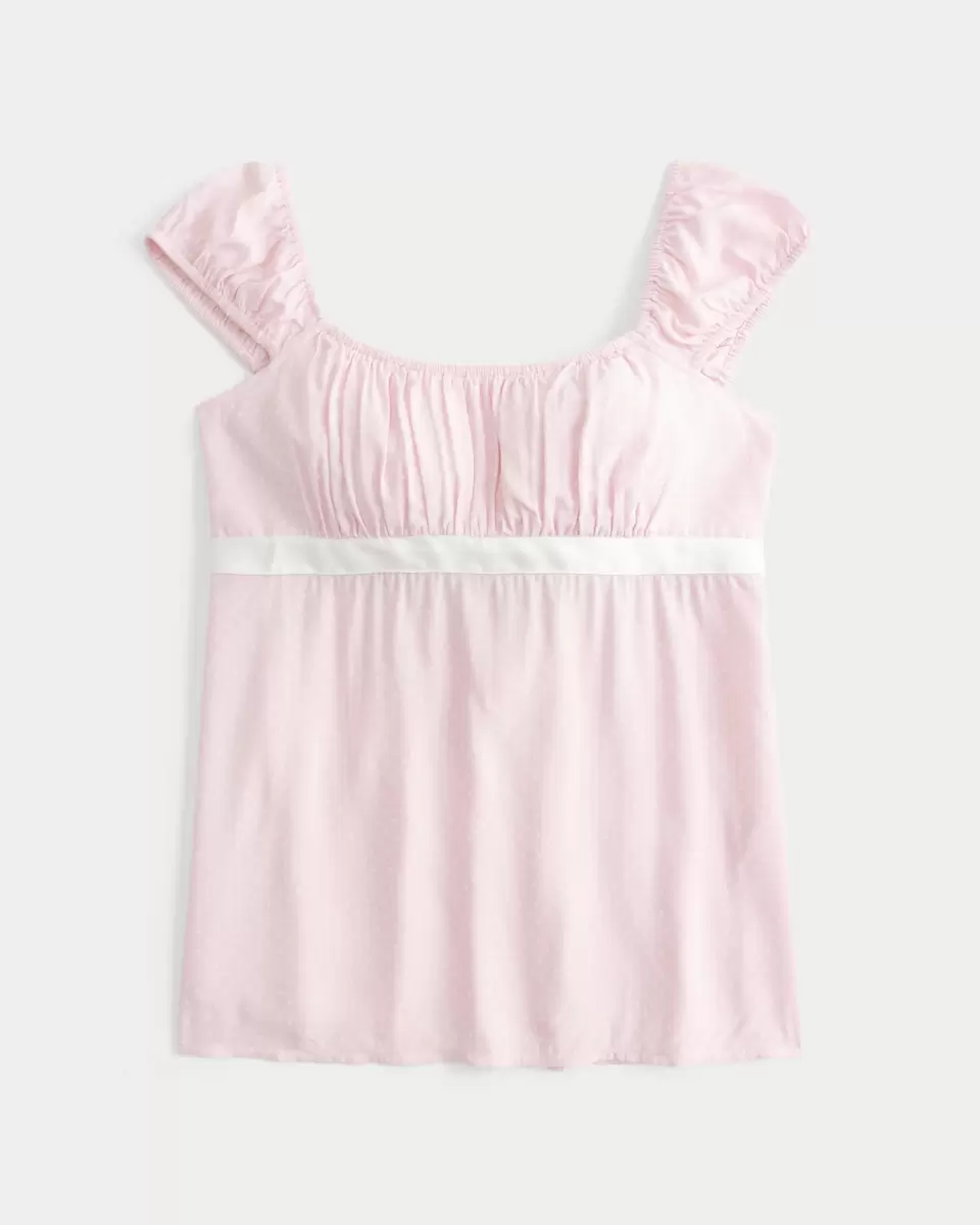 A pretty and super soft Y2K-inspired babydoll top featuring a satin tie detail at the waist and ruched detailing through the bust. Soft smocked back. Easy Fit. Imported.