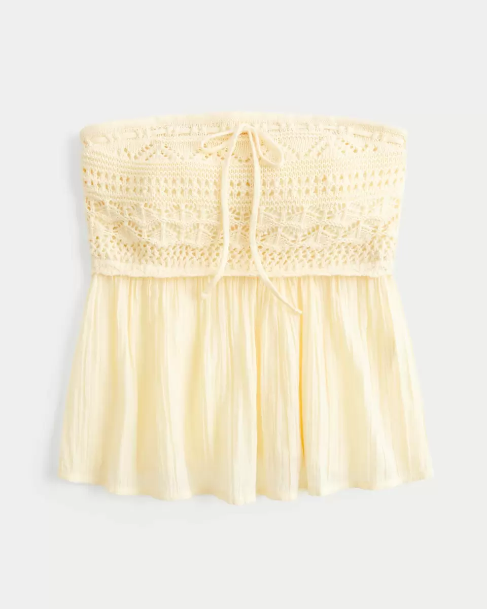 This cute and comfy babydoll top is designed with crochet-style fabric at the top and a soft and flowy voile fabric hem. Pretty interlaced tie at the neckline, strapless. Looks amazing dressed up or down! Easy Fit. Imported.