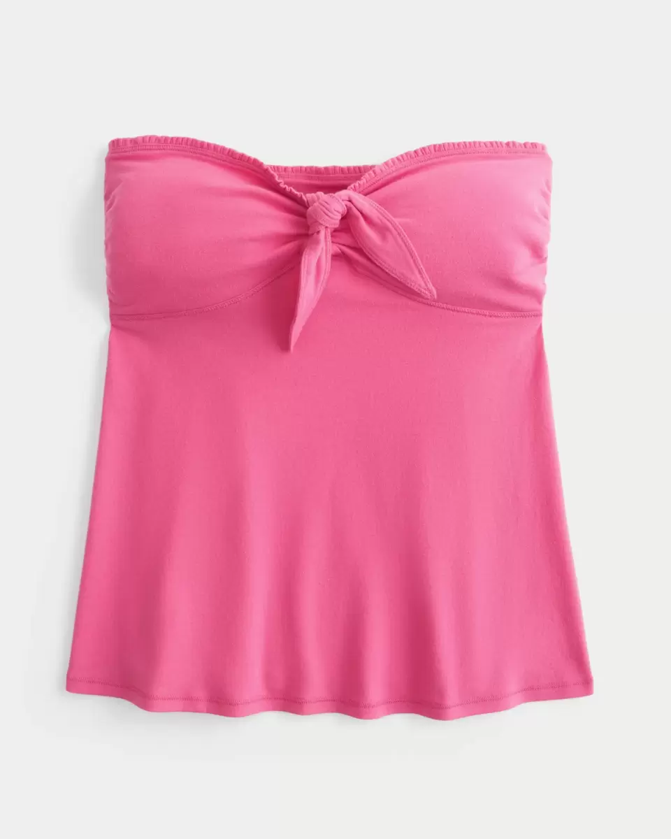 A cute and super soft strapless babydoll top, featuring a center tie detail and cinching through the bust. Double-lined at bust, soft jersey fabric, silhouette eases toward the hem. Easy Fit. Imported.