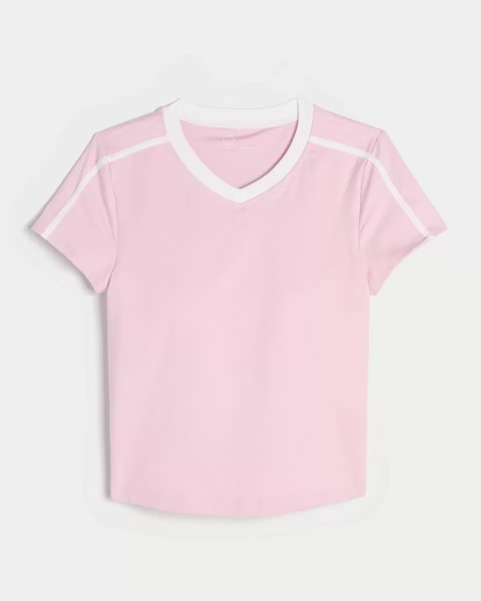 This super soft and comfy baby tee features a v-neckline and sporty stripe along the sleeves. Short sleeves, built-in shelf bra with removable pads. Imported.