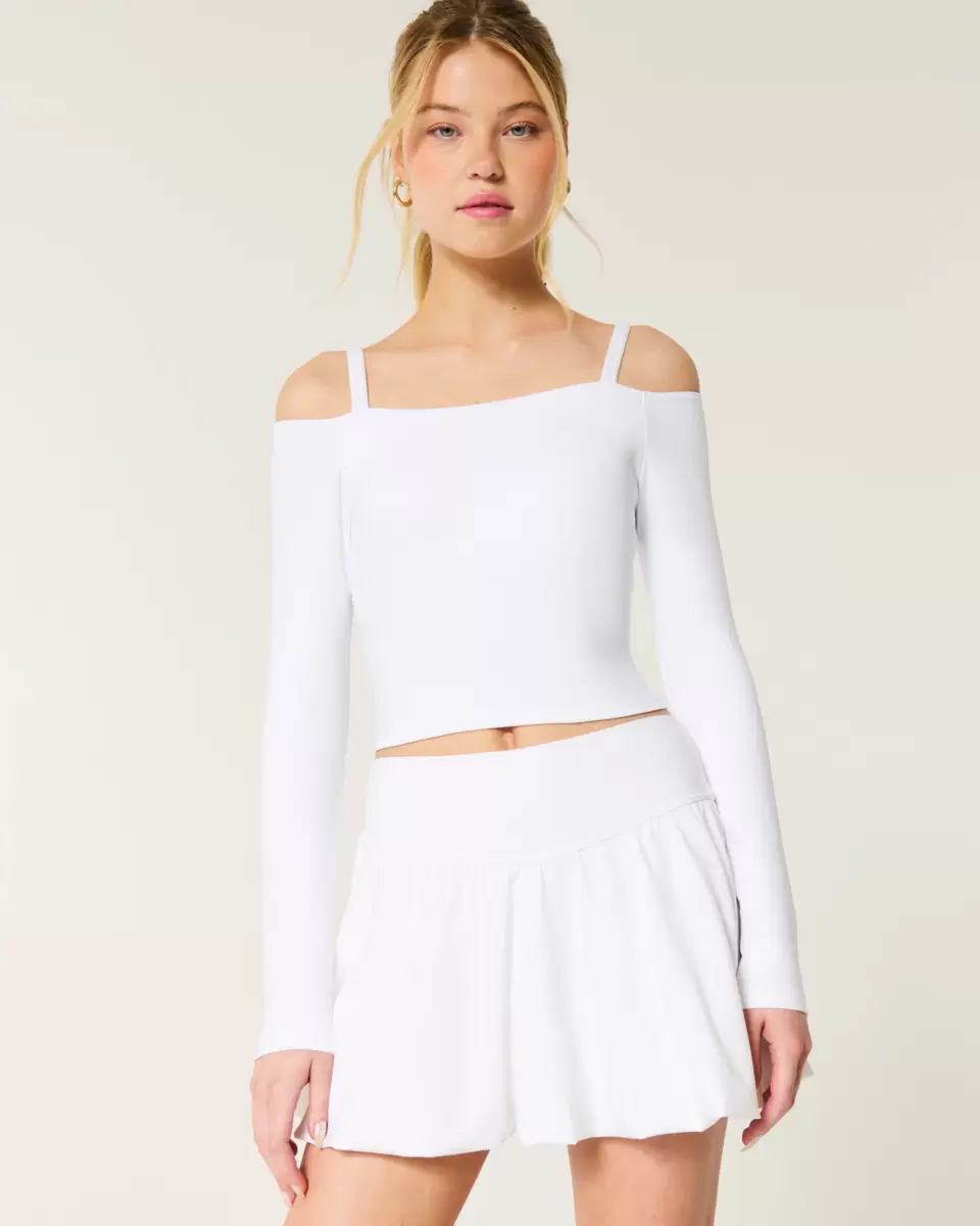 This super cute top is designed in our breathable, 4-way stretch, moisture-wicking Recharge fabric with a super soft, brushed feel. Off-the-shoulder neckline with thin shoulder straps, built-in shelf bra with removable pads. Long sleeves. Imported.