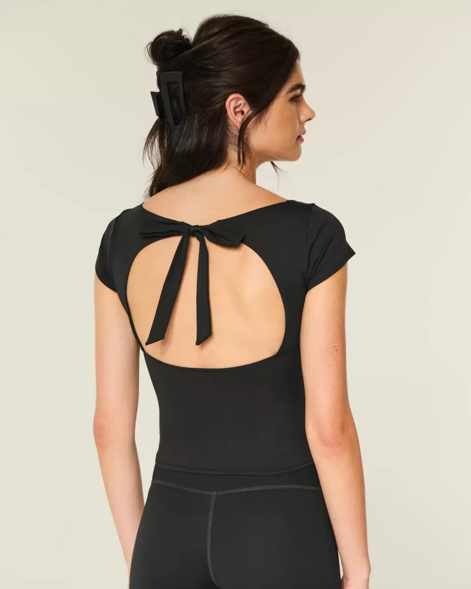 This cute, super soft active ballet top has short sleeves and open back with tie closure. Imported.