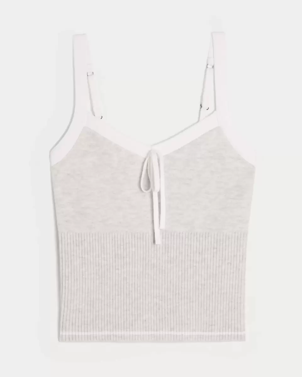 A cozy and super soft sweater-knit tank with a pretty tie detail at the neckline and adjustable straps. Ribbed hem. Imported.