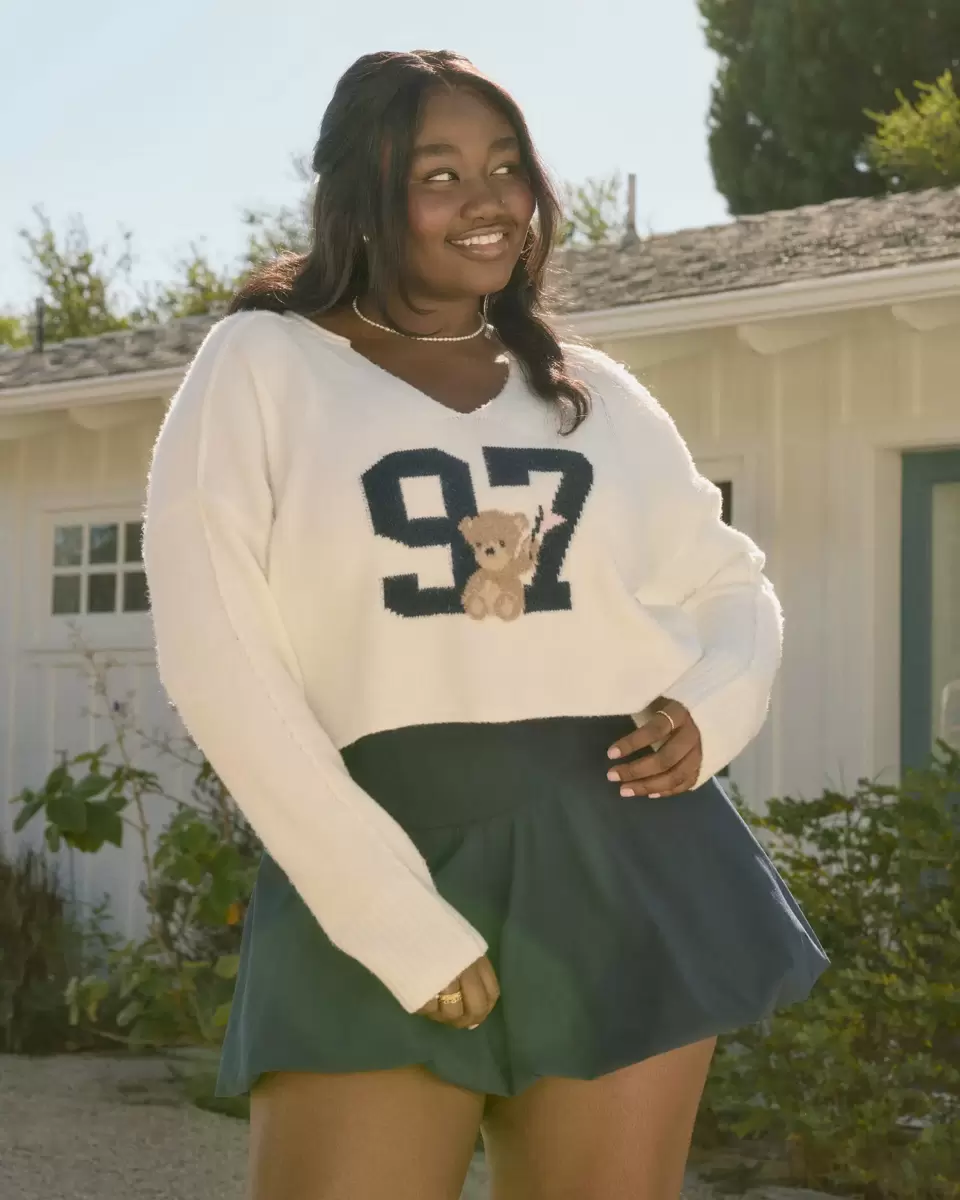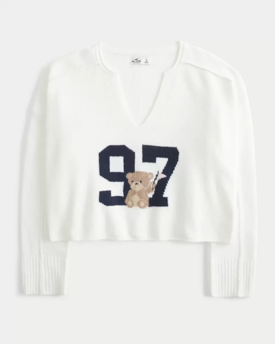 Super soft and comfy, this sweater features a 97 number intarsia graphic with a cute teddy bear detail. Notch neckline, long sleeves with ribbed hems. Imported.