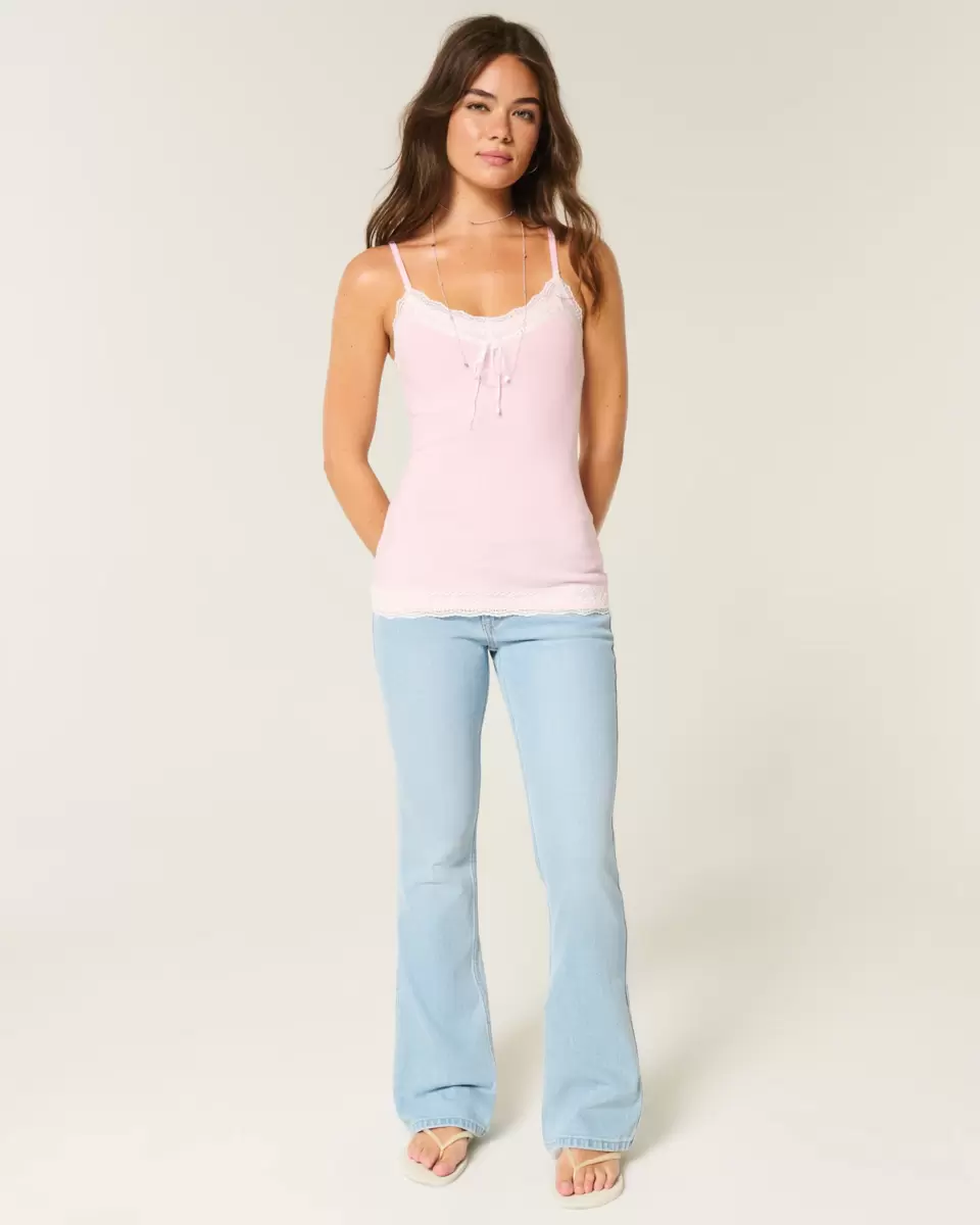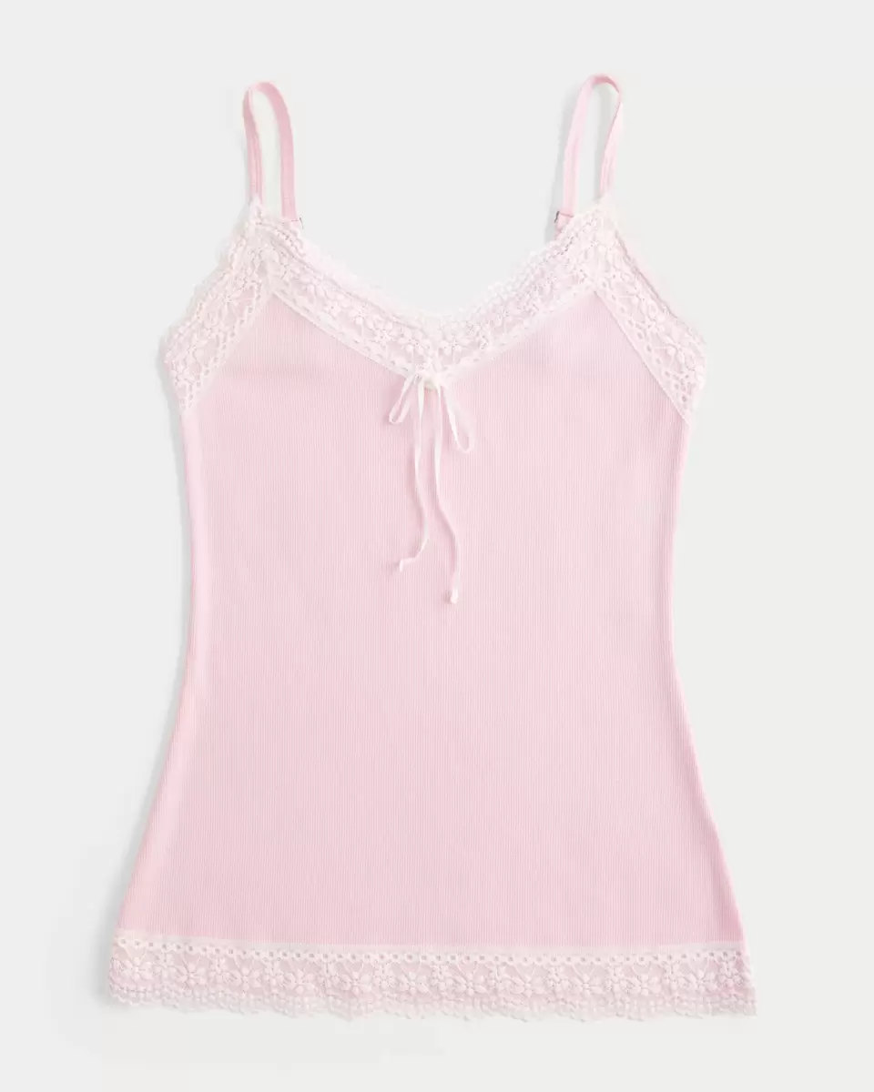 Pretty and super soft, this Y2K-inspired cami features lace trim at the neckline and hem, plus a bow detail at the center neckline. Adjustable straps. Slim Fit. Imported.