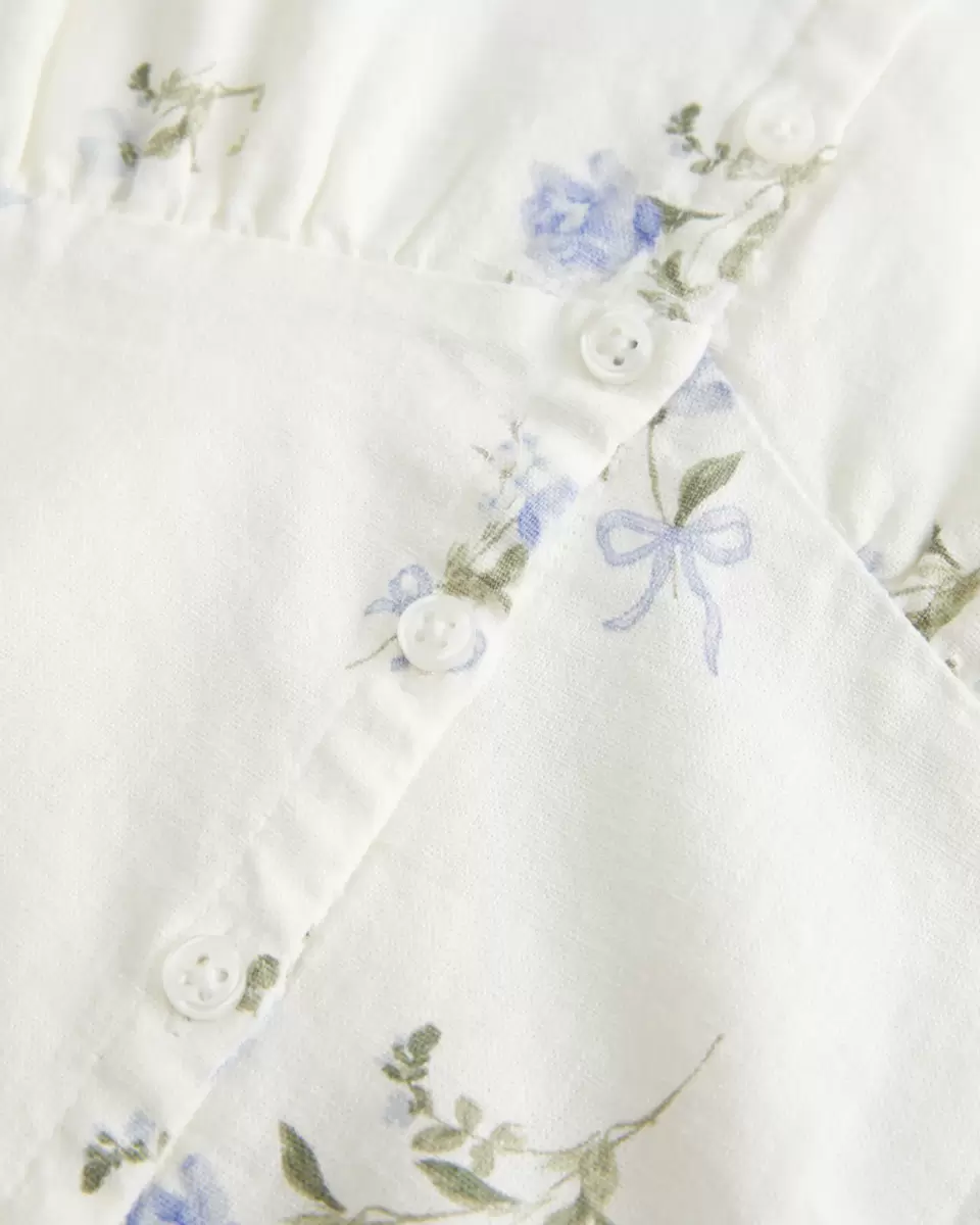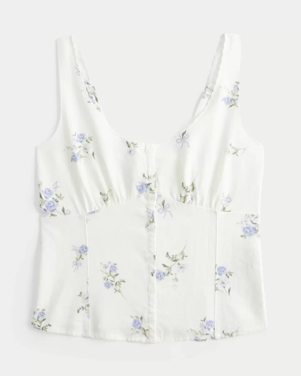 This pretty blouse features pretty embroidered detailing and scalloped trim along the straps, a scoop neckline and button-through closure. Soft smocked back. Slim Fit.