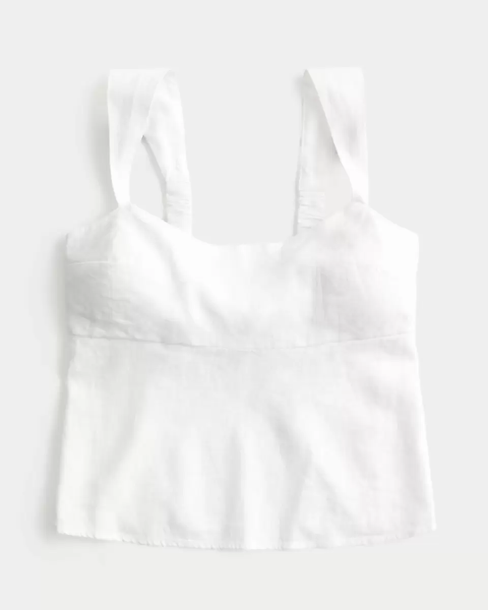 Made with a soft linen blend, this pretty top features an open back with tie closure. Built-in pads, wide straps. Slim Fit. Imported.