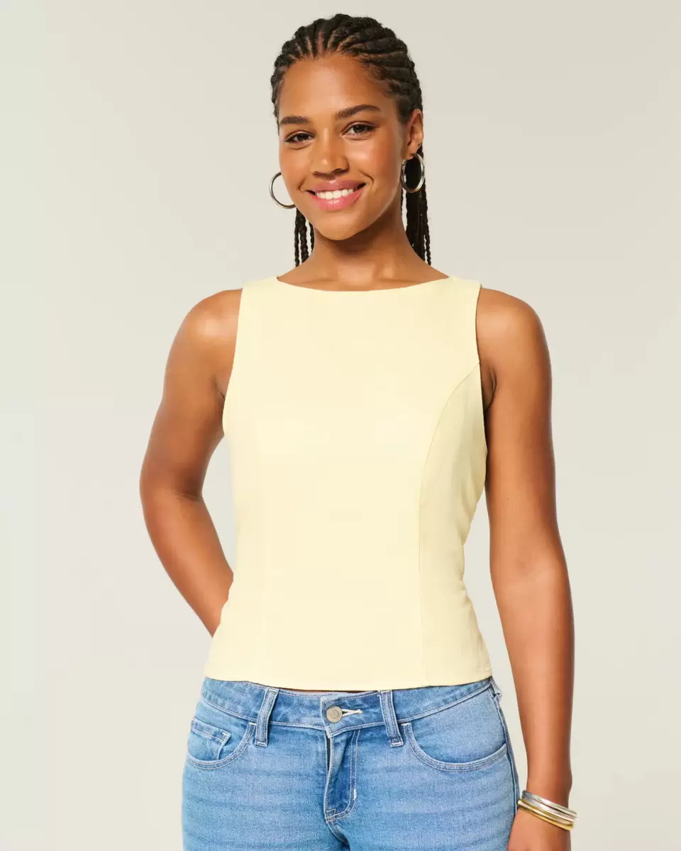 A super cute top in a soft linen blend, designed with an open back and high neckline. Back tie closure, seam details. Slim Fit.