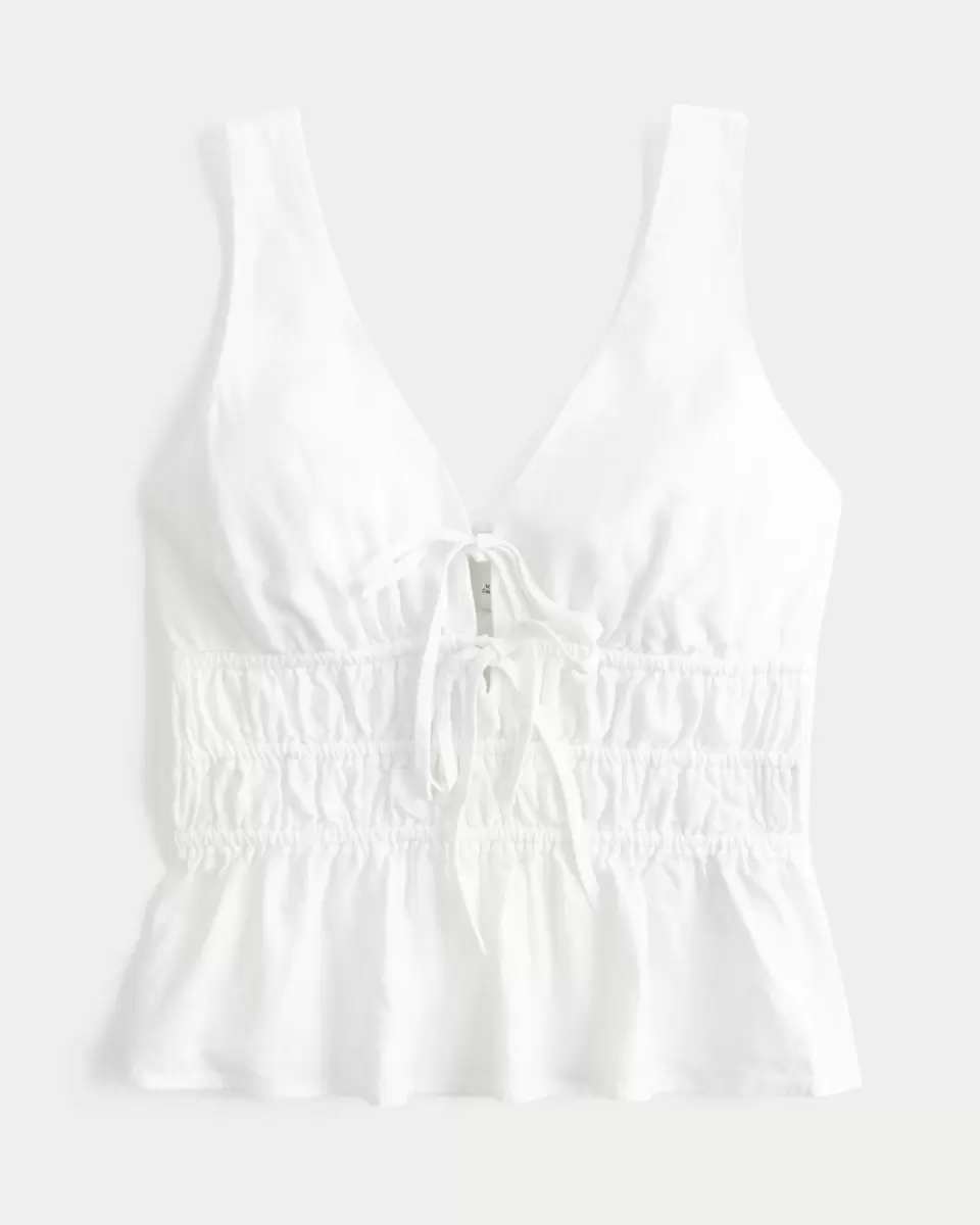 A cute peplum top in a soft linen blend, featuring a front tie detail and channeling through the waist. V-neckline. Slim Fit. Imported.