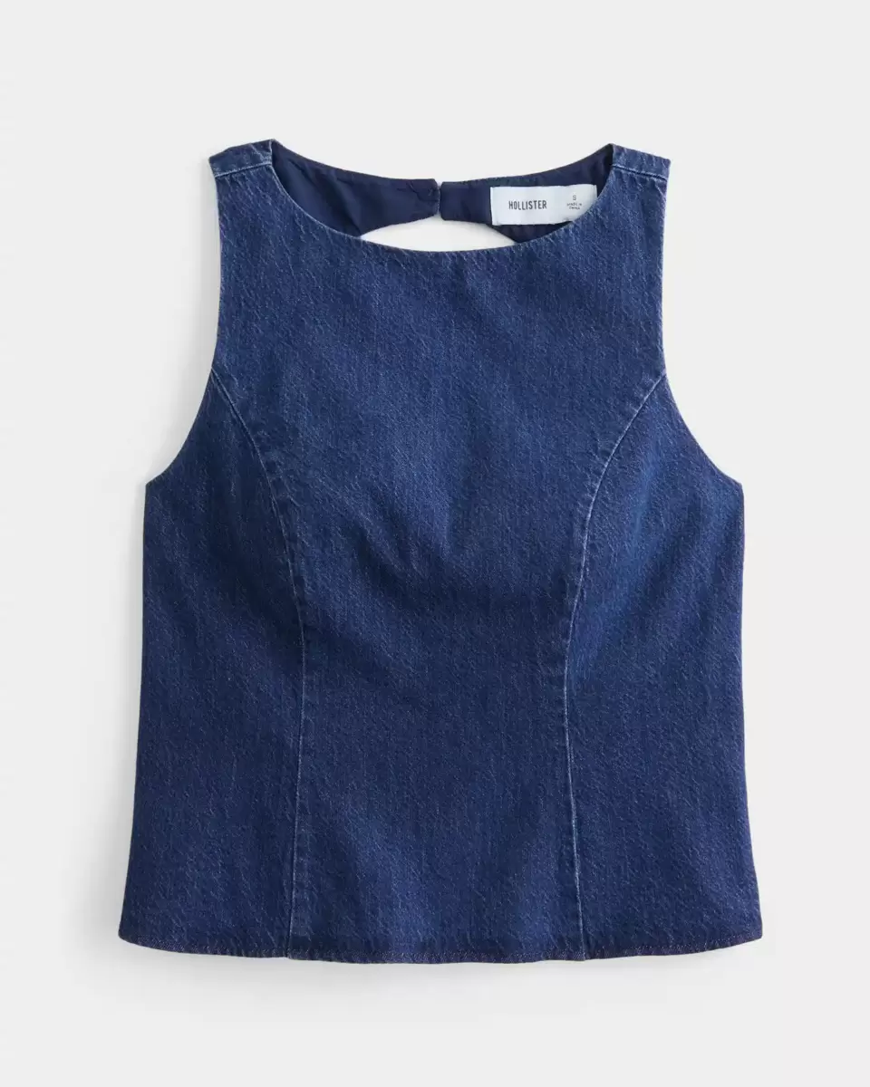 This cute denim blouse features an open back and tie-back bow detail. High neckline, removable pads. Slim Fit.
