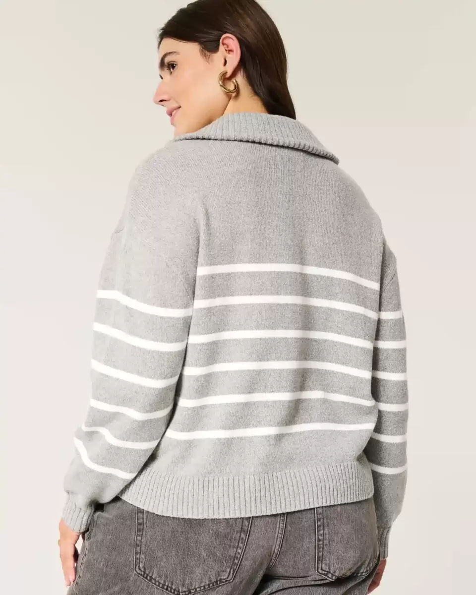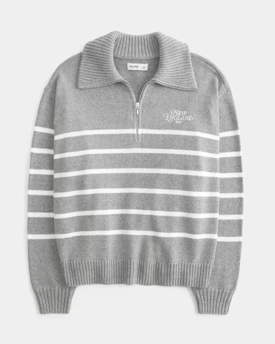 A cozy and super soft sweater with a foldover collar and half-zip closure. Ribbed trims, long sleeves, embroidered New England graphic embroidery at the left chest. Oversized Fit. Imported.