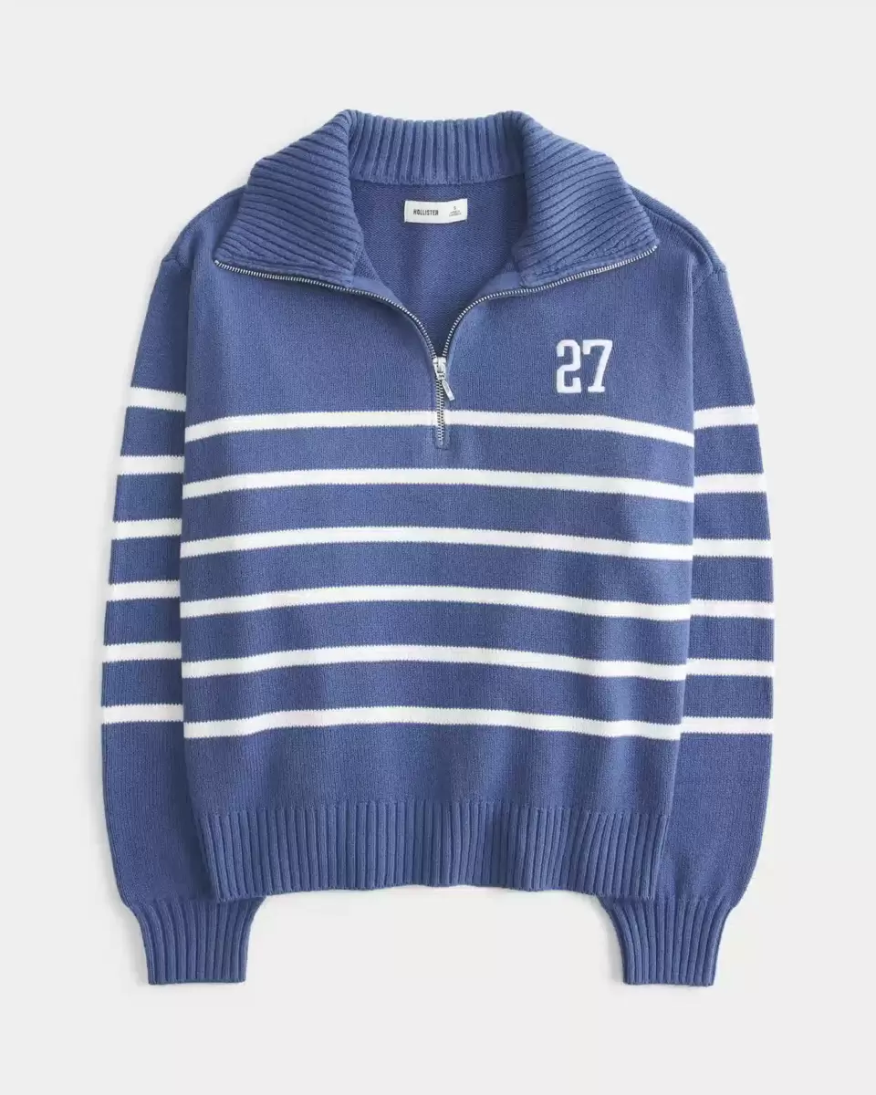 A cozy and super soft sweater with a foldover collar and half-zip closure. Embroidered 27 number graphic at left chest, long sleeves, ribbed trims. Oversized Fit. Imported.