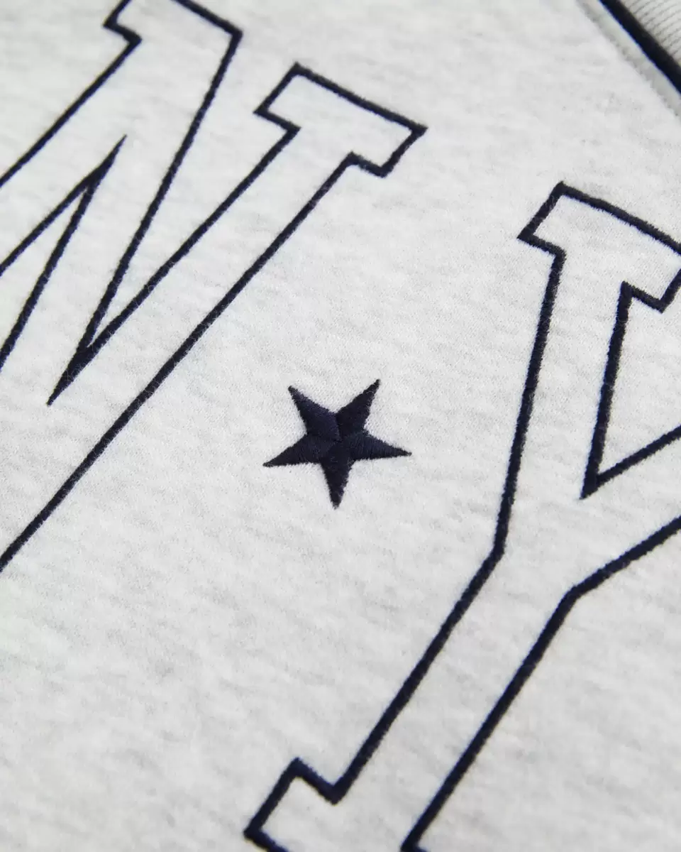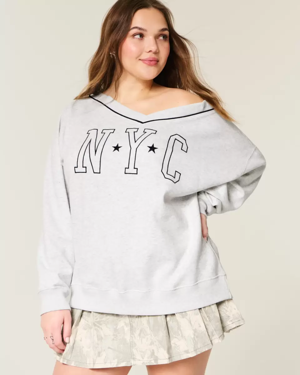 This comfy and super soft fleece sweatshirt features NYC graphic embroidery and an off-the-shoulder v-neckline. Long sleeves. Oversized Fit. Imported.