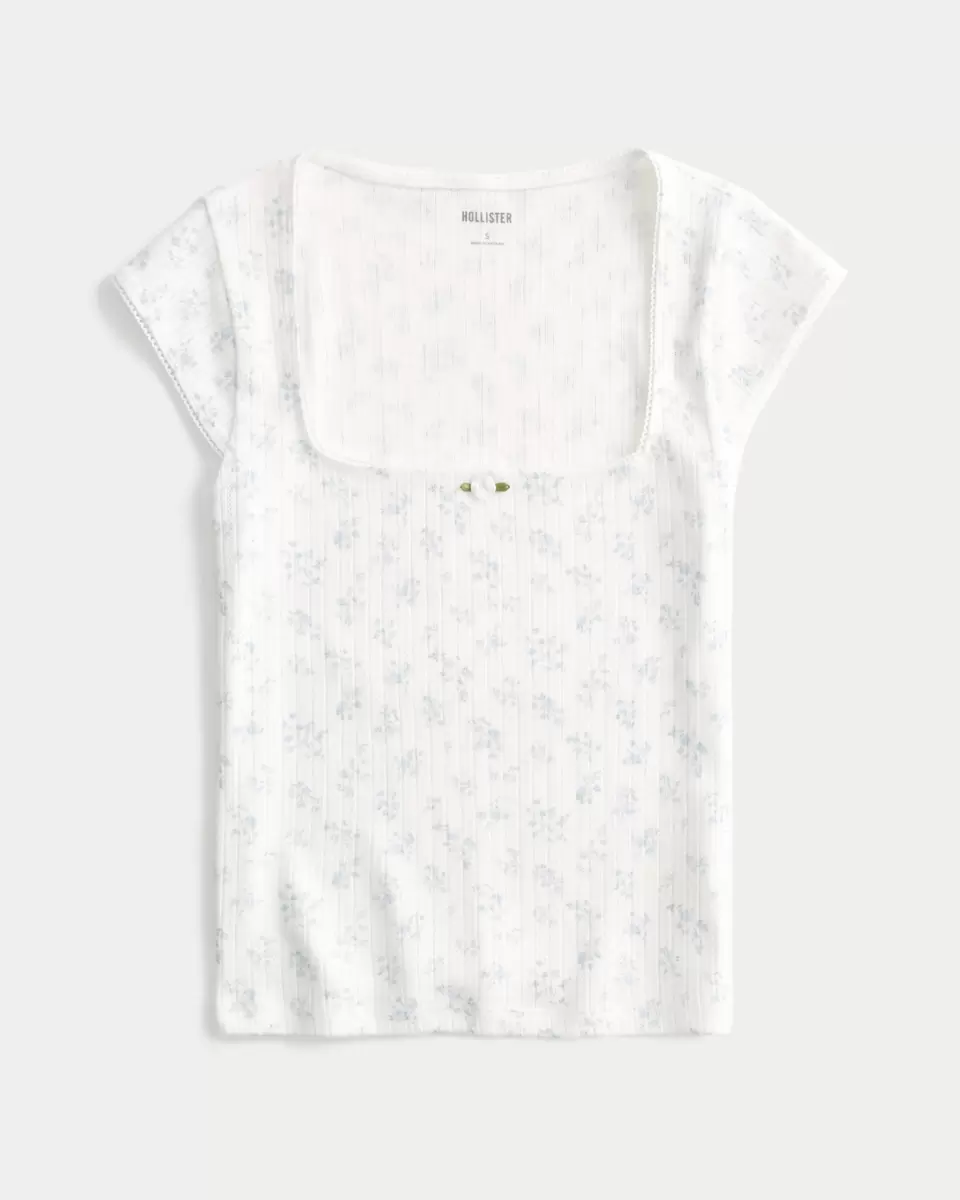 Your new fave top is made with super soft pointelle fabric and features a square neckline with a cute rosette detail at the center and picot trim. Slim Fit. Imported.