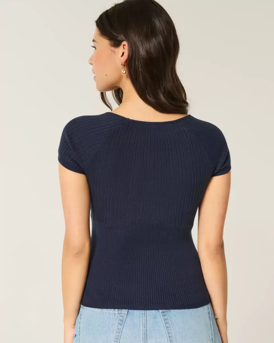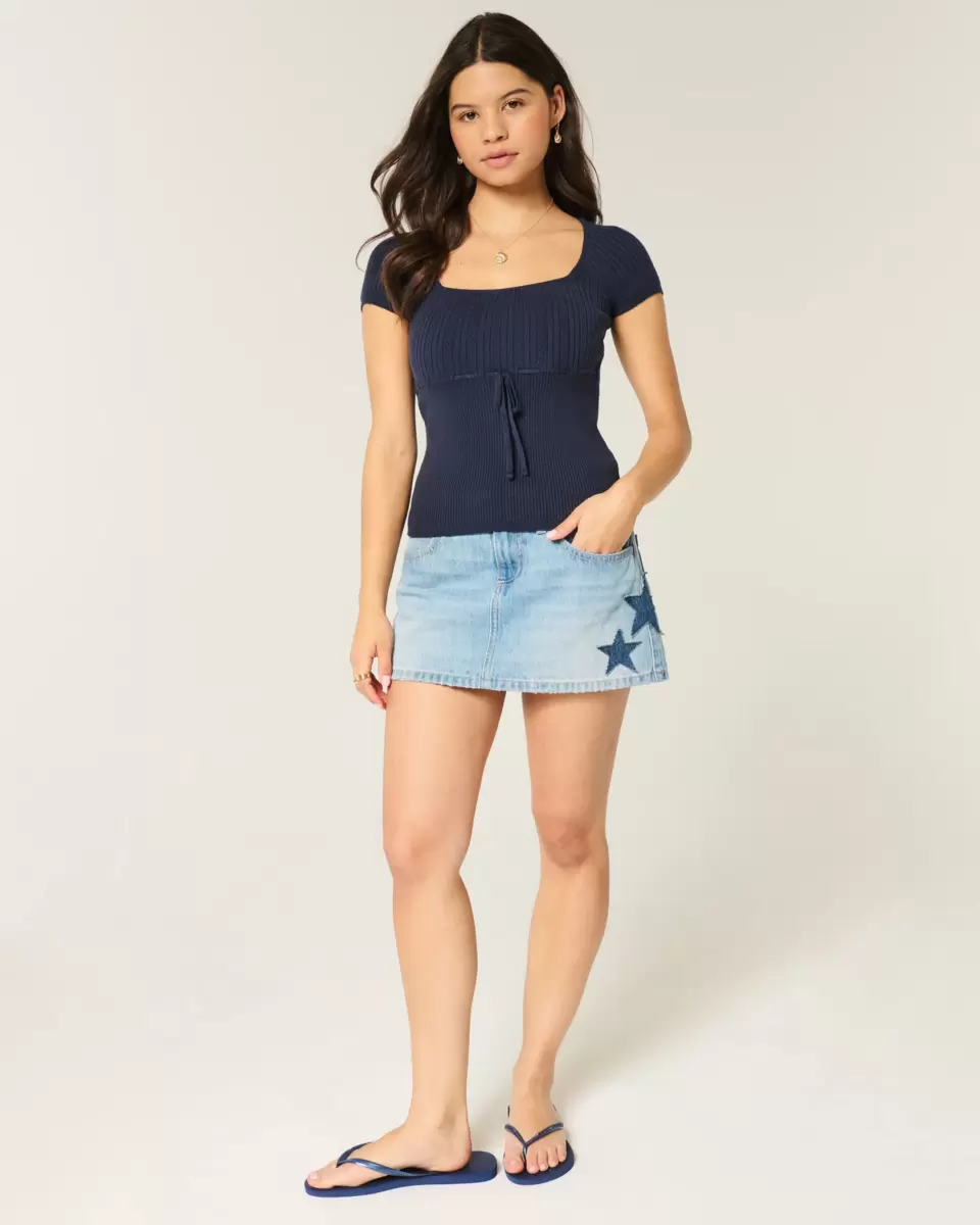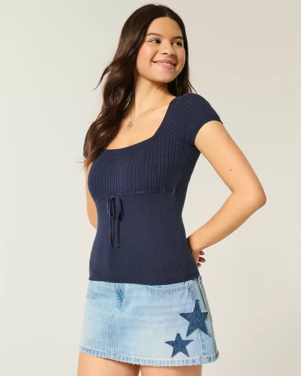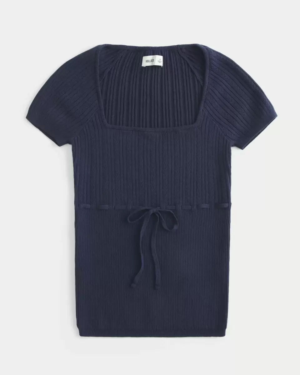 Cute and super soft, this short-sleeve sweater features ribbed texture and a tie detail through the waist. Square neckline. Imported.